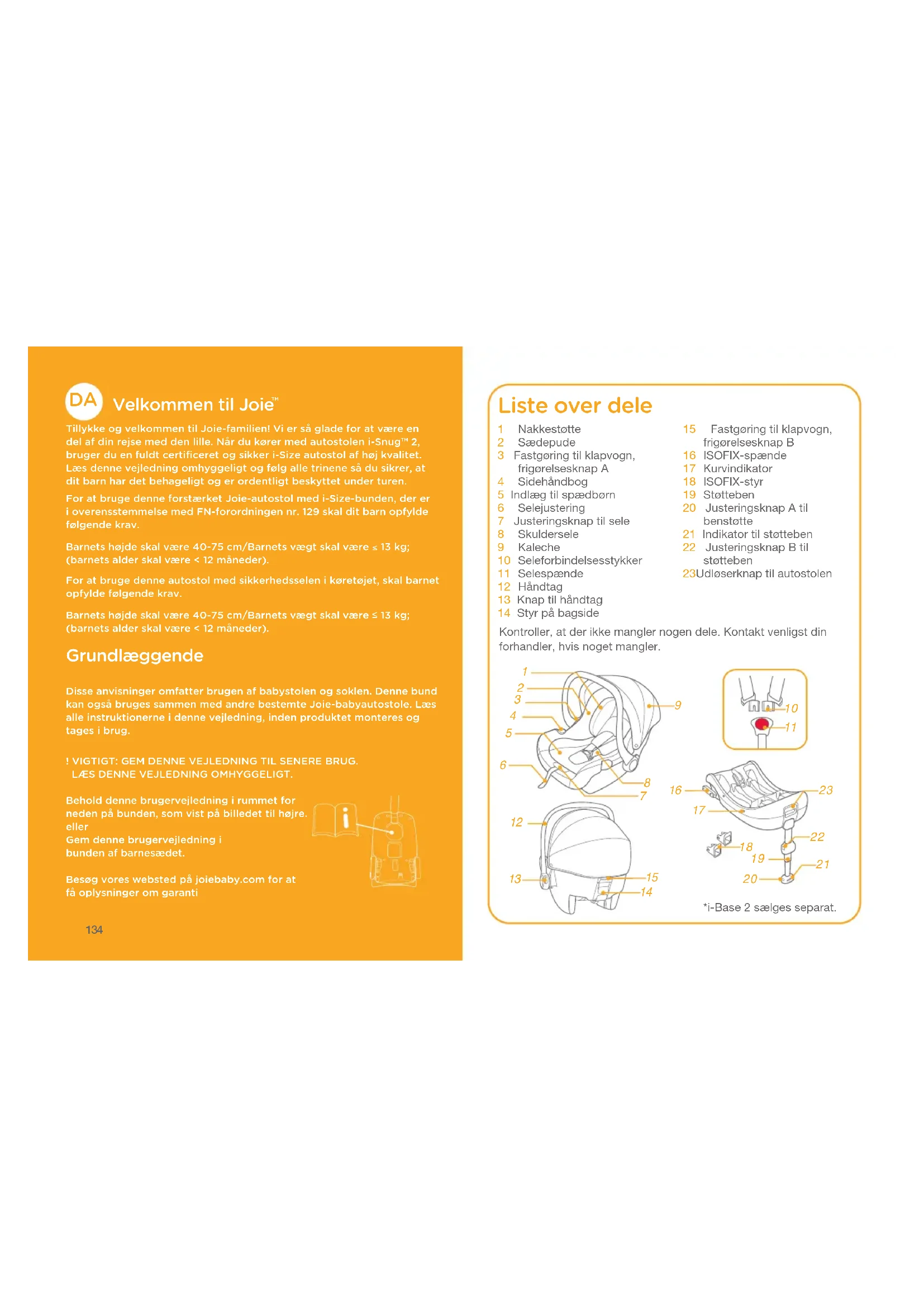 *i-Base 2 sælges separat. Kontroller, at der ikke mangler nogen dele. Kontakt venligst din forhandler, hvis noget mangler. 1 Nakkestøtte 2 Sædepude 3 Fastgøring til klapvogn, frigørelsesknap A 4 Sidehåndbog 5 Indlæg til spædbørn 6 Selejustering 7 Justeringsknap til sele 8 Skuldersele 9 Kaleche 10 Seleforbindelsesstykker 11 Selespænde 12 Håndtag 13 Knap til håndtag 14 Styr på bagside Liste over dele 15 Fastgøring til klapvogn, frigørelsesknap B 16 ISOFIX-spænde 17 Kurvindikator 18 ISOFIX-styr 19 Støtteben 20 Justeringsknap A til benstøtte 21 Indikator til støtteben 22 Justeringsknap B til støtteben 23 Udløserknap til autostolen135 136 ADVARSEL ! Når autostolen monteres SKAL du holde øje med at dens hårde genstande og plastdele ikke kan komme i klemme i et bevægeligt sæde eller i en køretøjets døre. ! Autostolen må IKKE bruge i bagudvendt stilling på sæder med en aktiv airbag foran. ! For at bruge denne autostol med bund i henhold til FN regulativ nr. 129, skal dit barn opfylde følgende krav. Barnets højde skal være 40-75 cm/ Barnets vægt skal være ≤ 13 kg (Barnets alder skal være ≤ 12 måneder). ! For at bruge denne autostol med sikkerhedsselen i køretøjet, skal barnet opfylde følgende krav. Barnets højde skal være 40-75 cm/ Barnets vægt skal være ≤ 13 kg (Barnets alder skal være ≤ 12 måneder). ! Autostolen passer muligvis ikke til alle godkendte køretøjer. Se venligst listen over mål for flere oplysninger. ! En sele, der holder autostolen fast til køretøjet, skal altid sidde stramt. og støtten skal røre bunden i køretøjet. En sele eller en skærm, der fastholder barnet, skal justeres, så den passer til barnets krop. En sele må aldrig være snoet. ! Brug IKKE andre bærepunkter for belastning udover de, som er beskrevet i anvisningerne, og som er markeret på autostolen. ! Når dit barn er anbragt i denne autostol, skal sikkerhedsselen bruges korrekt. ! Hvis denne forstærket autostol udsættes for voldsomme belastninger i en ulykke, skal den skiftes. En ulykke kan forårsage skader, som ikke kan ses. ! Vær opmærksom på faren ved at foretage ændringer eller tilføjelser til anordningen, uden godkendelse af den typegodkendende myndighed, og faren ved ikke at følge autostolens installationsvejledninger, der følger med produktet. ! Denne forstærkede autostol skal holdes væk fra sollys, da den ellers kan blive for varm for barnets hud. Mærk altid efter med en hånd, inden du anbringer barnet i autostolen. ! Efterlad ALDRIG dit barn i autostolen uden opsyn. ADVARSEL ! Bagage eller andre genstande kan føre til skader i tilfælde af et sammenstød, og de skal derfor spændes ordentligt fast. ! Autostolen må IKKE bruges uden de bløde dele. ! De bløde dele må ikke erstattes med nogen andre dele, undtagen dele der anbefales af producenten, da de bløde dele er en integreret del af autostolens funktion. ! Kontroller, om denne autostol kan monteres korrekt i dit køretøj, før du køber det. ! INGEN autostol kan garantere en fuld beskyttelse imod kvæstelser ved en ulykke. Korrekt brug af denne autostol kan dog nedsætte risikoen for alvorlige kvæstelser eller dødsfald. ! Du MÅ IKKE montere autostolen uden at følge instruktionerne og advarslerne i denne brugsanvisning, da du ellers kan udsætte dit barn for alvorlig risiko for personskade eller dødsfald. ! Brug IKKE denne autostol, hvis den er beskadiget eller mangler dele. ! Instruktionerne skal opbevares i autostolen i hele dens levetid. ! Når en “i-Size autosto” bruges, bedes brugeren også se vejledningen til køretøjet. ! Autostolen må IKKE bruge i bagudvendt stilling på sæder med en aktiv airbag foran.137 138 Figure for Installation Child height 40cm-75cm/ Child weight≤13kg (Child age≤12 months) Child height 40cm-75cm/ Child weight≤13kg (Child age≤12 months) Suitable for Child height 40cm-75cm/ Child weight≤13kg Child age≤12 months I tilfælde af en nødsituation I tilfælde af en nødsituation eller ulykker er det vigtigst, at dit barn straks får førstehjælp og lægebehandling. Produktoplysninger i-Snug™ 2 autostolen er kompatibelt med i-Base 2, i-Base lx 2, i-Base Advance, i-Base Encore.
