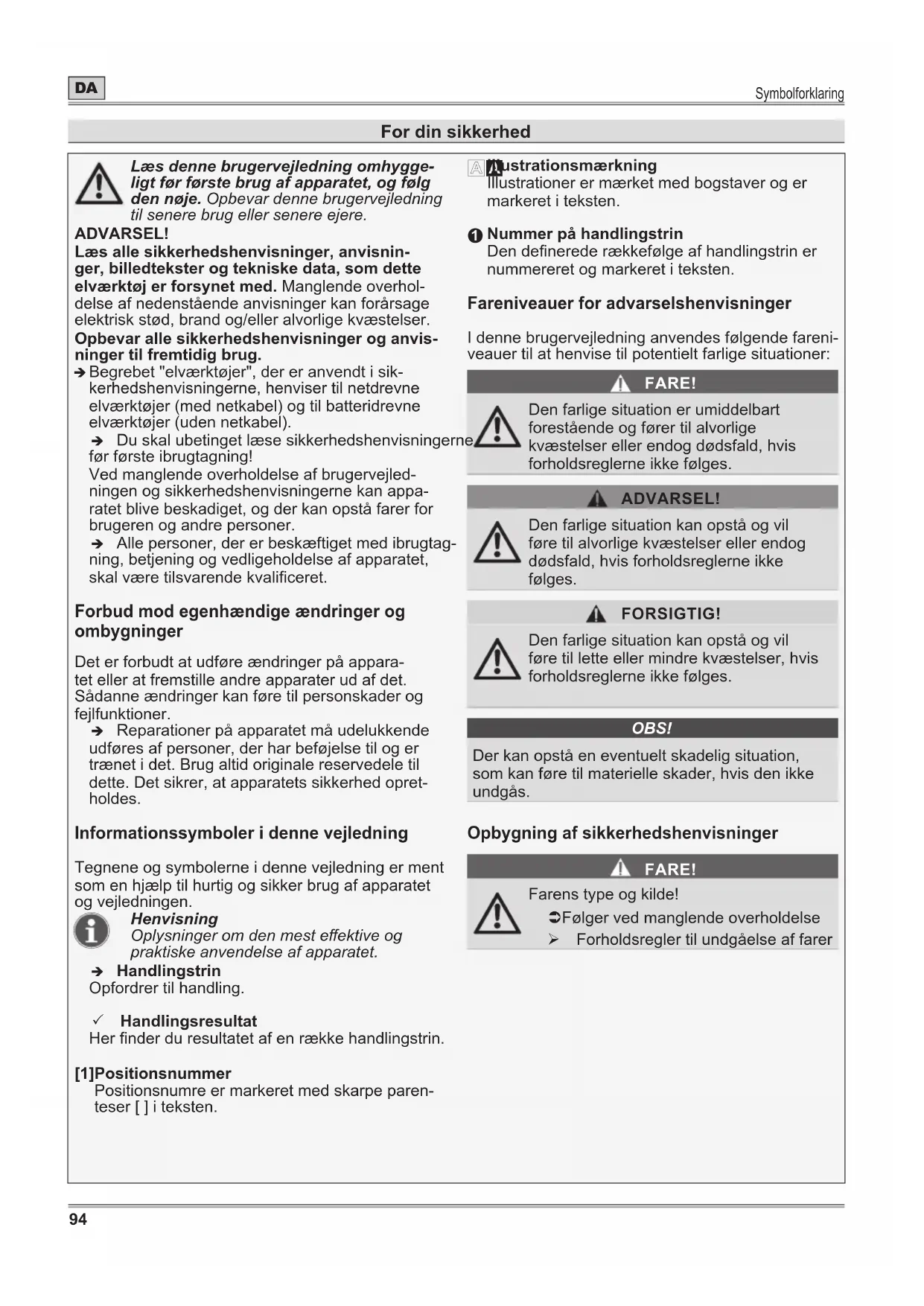 For din sikkerhed Læs denne brugervejledning omhygge- ligt før første brug af apparatet, og følg den nøje. Opbevar denne brugervejledning til senere brug eller senere ejere. ADVARSEL! Læs alle sikkerhedshenvisninger, anvisnin- ger, billedtekster og tekniske data, som dette elværktøj er forsynet med. Manglende overhol- delse af nedenstående anvisninger kan forårsage elektrisk stød, brand og/eller alvorlige kvæstelser. Opbevar alle sikkerhedshenvisninger og anvis- ninger til fremtidig brug. Î Begrebet "elværktøjer", der er anvendt i sik- kerhedshenvisningerne, henviser til netdrevne elværktøjer (med netkabel) og til batteridrevne elværktøjer (uden netkabel). Î Du skal ubetinget læse sikkerhedshenvisningerne før første ibrugtagning! Ved manglende overholdelse af brugervejled- ningen og sikkerhedshenvisningerne kan appa- ratet blive beskadiget, og der kan opstå farer for brugeren og andre personer. Î Alle personer, der er beskæftiget med ibrugtag- ning, betjening og vedligeholdelse af apparatet, skal være tilsvarende kvaliceret. Forbud mod egenhændige ændringer og ombygninger Det er forbudt at udføre ændringer på appara- tet eller at fremstille andre apparater ud af det. Sådanne ændringer kan føre til personskader og fejlfunktioner. Î Reparationer på apparatet må udelukkende udføres af personer, der har beføjelse til og er trænet i det. Brug altid originale reservedele til dette. Det sikrer, at apparatets sikkerhed opret- holdes. Informationssymboler i denne vejledning Tegnene og symbolerne i denne vejledning er ment som en hjælp til hurtig og sikker brug af apparatet og vejledningen. Henvisning Oplysninger om den mest eektive og praktiske anvendelse af apparatet. Î Handlingstrin Opfordrer til handling. 3 Handlingsresultat Her nder du resultatet af en række handlingstrin. [1]Positionsnummer Positionsnumre er markeret med skarpe paren- teser [ ] i teksten.