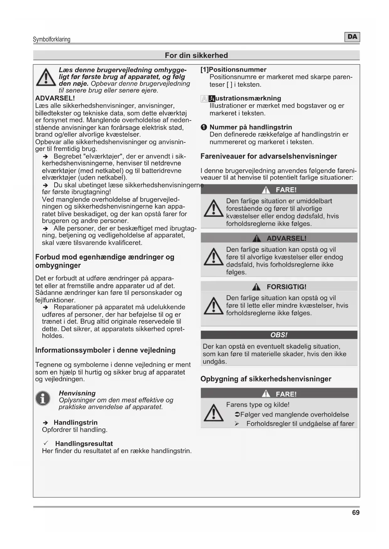 For din sikkerhed Læs denne brugervejledning omhygge- ligt før første brug af apparatet, og følg den nøje. Opbevar denne brugervejledning til senere brug eller senere ejere. ADVARSEL! Læs alle sikkerhedshenvisninger, anvisninger, billedtekster og tekniske data, som dette elværktøj er forsynet med. Manglende overholdelse af neden- stående anvisninger kan forårsage elektrisk stød, brand og/eller alvorlige kvæstelser. Opbevar alle sikkerhedshenvisninger og anvisnin- ger til fremtidig brug. Î Begrebet "elværktøjer", der er anvendt i sik- kerhedshenvisningerne, henviser til netdrevne elværktøjer (med netkabel) og til batteridrevne elværktøjer (uden netkabel). Î Du skal ubetinget læse sikkerhedshenvisningerne før første ibrugtagning! Ved manglende overholdelse af brugervejled- ningen og sikkerhedshenvisningerne kan appa- ratet blive beskadiget, og der kan opstå farer for brugeren og andre personer. Î Alle personer, der er beskæftiget med ibrugtag- ning, betjening og vedligeholdelse af apparatet, skal være tilsvarende kvaliceret. Forbud mod egenhændige ændringer og ombygninger Det er forbudt at udføre ændringer på appara- tet eller at fremstille andre apparater ud af det. Sådanne ændringer kan føre til personskader og fejlfunktioner. Î Reparationer på apparatet må udelukkende udføres af personer, der har beføjelse til og er trænet i det. Brug altid originale reservedele til dette. Det sikrer, at apparatets sikkerhed opret- holdes. Informationssymboler i denne vejledning Tegnene og symbolerne i denne vejledning er ment som en hjælp til hurtig og sikker brug af apparatet og vejledningen. Henvisning Oplysninger om den mest effektive og praktiske anvendelse af apparatet. Î Handlingstrin Opfordrer til handling. 3 Handlingsresultat Her nder du resultatet af en række handlingstrin. [1]Positionsnummer Positionsnumre er markeret med skarpe paren- teser [ ] i teksten.