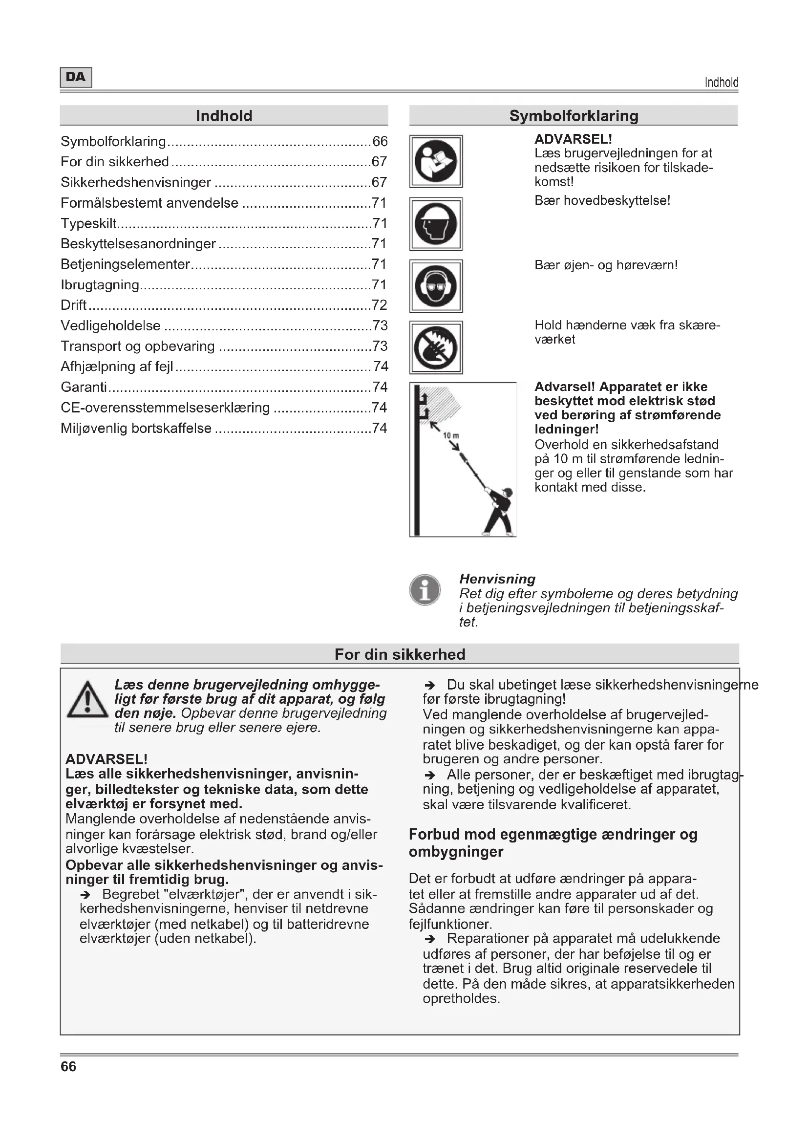 - Miljøvenlig bortskaffelse Symbolforklaring ADVARSEL! Læs brugervejledningen for at nedsætte risikoen for tilskade- komst! Bær hovedbeskyttelse! Bær øjen- og høreværn! Hold hænderne væk fra skære- værket Advarsel! Apparatet er ikke beskyttet mod elektrisk stød ved berøring af strømførende ledninger! Overhold en sikkerhedsafstand på 10 m til strømførende lednin- ger og eller til genstande som har kontakt med disse. Henvisning Ret dig efter symbolerne og deres betydning i betjeningsvejledningen til betjeningsskaf- tet. For din sikkerhed Læs denne brugervejledning omhygge- ligt før første brug af dit apparat, og følg den nøje. Opbevar denne brugervejledning til senere brug eller senere ejere. ADVARSEL! Læs alle sikkerhedshenvisninger, anvisnin- ger, billedtekster og tekniske data, som dette elværktøj er forsynet med. Manglende overholdelse af nedenstående anvis- ninger kan forårsage elektrisk stød, brand og/eller alvorlige kvæstelser. Opbevar alle sikkerhedshenvisninger og anvis- ninger til fremtidig brug. Î Begrebet "elværktøjer", der er anvendt i sik- kerhedshenvisningerne, henviser til netdrevne elværktøjer (med netkabel) og til batteridrevne elværktøjer (uden netkabel). Î Du skal ubetinget læse sikkerhedshenvisningerne før første ibrugtagning! Ved manglende overholdelse af brugervejled- ningen og sikkerhedshenvisningerne kan appa- ratet blive beskadiget, og der kan opstå farer for brugeren og andre personer. Î Alle personer, der er beskæftiget med ibrugtag- ning, betjening og vedligeholdelse af apparatet, skal være tilsvarende kvaliceret. Forbud mod egenmægtige ændringer og ombygninger Det er forbudt at udføre ændringer på appara- tet eller at fremstille andre apparater ud af det. Sådanne ændringer kan føre til personskader og fejlfunktioner. Î Reparationer på apparatet må udelukkende udføres af personer, der har beføjelse til og er trænet i det. Brug altid originale reservedele til dette. På den måde sikres, at apparatsikkerheden opretholdes.For din sikkerhed p. 74