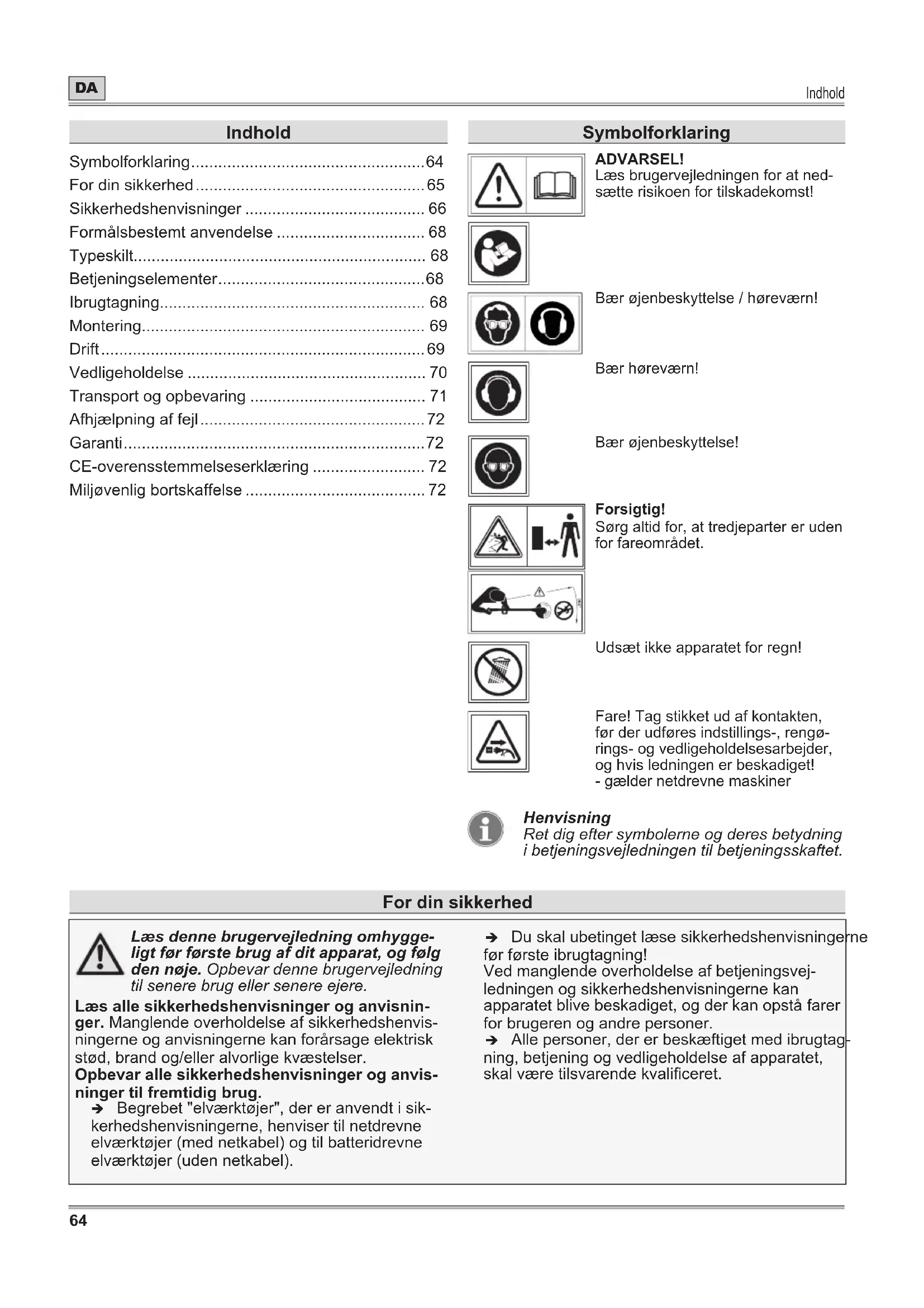 - Miljøvenlig bortskaffelse Symbolforklaring ADVARSEL! Læs brugervejledningen for at ned- sætte risikoen for tilskadekomst! Bær øjenbeskyttelse / høreværn! Bær høreværn! Bær øjenbeskyttelse! Forsigtig! Sørg altid for, at tredjeparter er uden for fareområdet. Udsæt ikke apparatet for regn! Fare! Tag stikket ud af kontakten, før der udføres indstillings-, rengø- rings- og vedligeholdelsesarbejder, og hvis ledningen er beskadiget! - gælder netdrevne maskiner Henvisning Ret dig efter symbolerne og deres betydning i betjeningsvejledningen til betjeningsskaftet. For din sikkerhed Læs denne brugervejledning omhygge- ligt før første brug af dit apparat, og følg den nøje. Opbevar denne brugervejledning til senere brug eller senere ejere. Læs alle sikkerhedshenvisninger og anvisnin- ger. Manglende overholdelse af sikkerhedshenvis- ningerne og anvisningerne kan forårsage elektrisk stød, brand og/eller alvorlige kvæstelser. Opbevar alle sikkerhedshenvisninger og anvis- ninger til fremtidig brug. Î Begrebet "elværktøjer", der er anvendt i sik- kerhedshenvisningerne, henviser til netdrevne elværktøjer (med netkabel) og til batteridrevne elværktøjer (uden netkabel). Î Du skal ubetinget læse sikkerhedshenvisningerne før første ibrugtagning! Ved manglende overholdelse af betjeningsvej- ledningen og sikkerhedshenvisningerne kan apparatet blive beskadiget, og der kan opstå farer for brugeren og andre personer. Î Alle personer, der er beskæftiget med ibrugtag- ning, betjening og vedligeholdelse af apparatet, skal være tilsvarende kvaliceret.For din sikkerhed p. 72