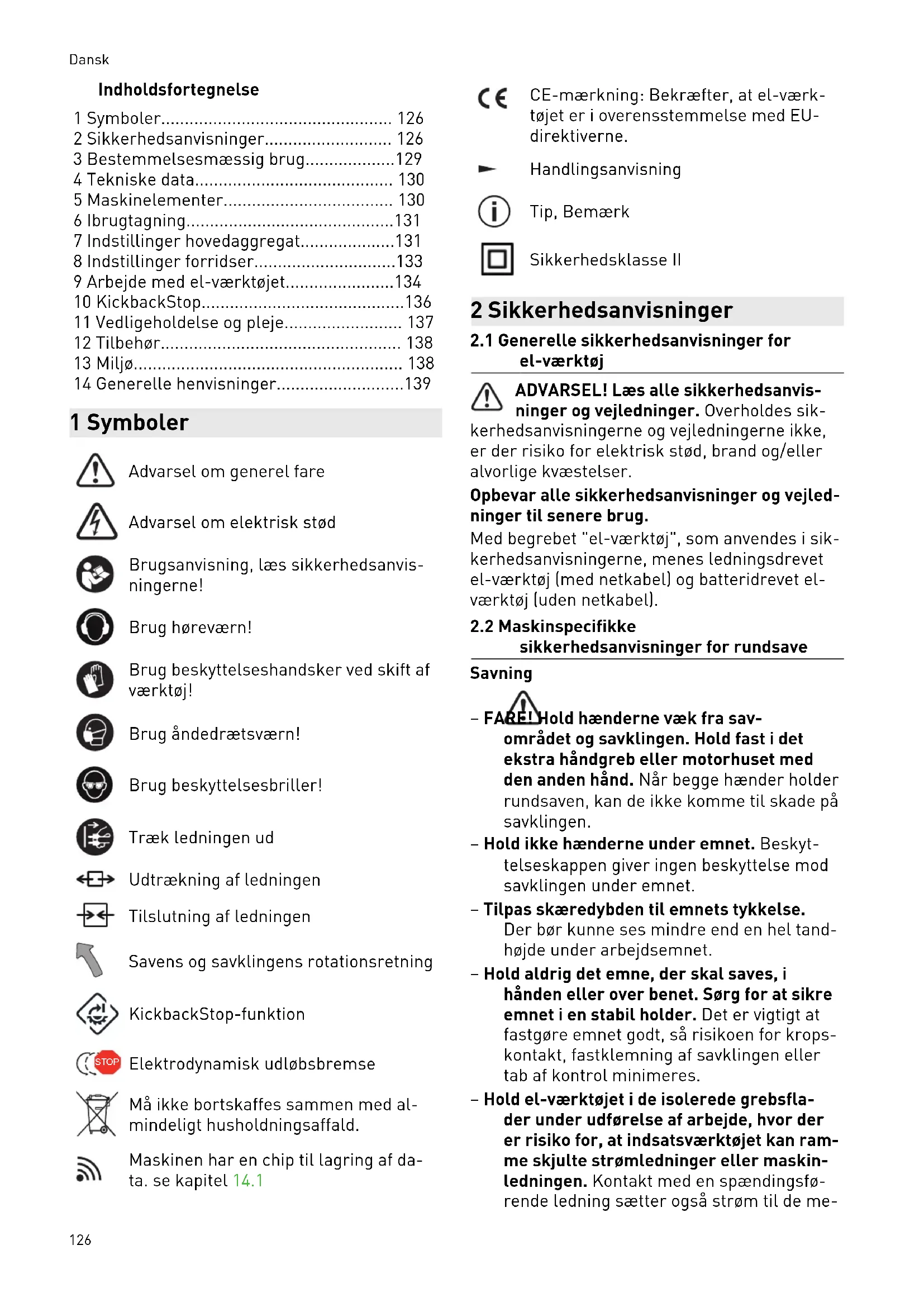 sikkerhedsanvisninger for rundsave Savning – FARE! Hold hænderne væk fra sav området og savklingen. Hold fast i det ekstra håndgreb eller motorhuset med den anden hånd. Når begge hænder holder rundsaven, kan de ikke komme til skade på savklingen. – Hold ikke hænderne under emnet. Beskyt telseskappen giver ingen beskyttelse mod savklingen under emnet. – Tilpas skæredybden til emnets tykkelse. Der bør kunne ses mindre end en hel tand højde under arbejdsemnet. – Hold aldrig det emne, der skal saves, i hånden eller over benet. Sørg for at sikre emnet i en stabil holder. Det er vigtigt at fastgøre emnet godt, så risikoen for krops kontakt, fastklemning af savklingen eller tab af kontrol minimeres. – Hold el-værktøjet i de isolerede grebsfla der under udførelse af arbejde, hvor der er risiko for, at indsatsværktøjet kan ram me skjulte strømledninger eller maskin ledningen. Kontakt med en spændingsfø rende ledning sætter også strøm til de me Dansk 126talliske maskindele og medfører elektrisk stød. – Anvend altid et anslag eller en lige føring skant ved længdesnit. Dette forbedrer snitnøjagtigheden og mindsker muligheden for, at savklingen sætter sig fast. – Anvend altid savklinger i den rigtige stør relse og med passende holdeboring (f.eks. rudeformet eller rund). Savklinger, der ik ke passer til savens monteringsdele, løber skævt og medfører tab af kontrol. – Anvend aldrig beskadigede eller forkerte savklingespændeflanger eller -skruer. Savklingespændeflangerne og -skruerne er konstrueret specielt til din sav med henblik på optimal ydelse og driftssikkerhed. Tilbageslag – årsager og tilsvarende sikker hedsanvisninger – Et tilbageslag er en pludselig reaktion fra en fastsiddende, fastklemt eller forkert placeret savklinge, der medfører, at en ukontrolleret sav løfter sig ud af emnet og bevæger sig i retning af brugeren. – Hvis savklingen sætter sig fast i savsnittet, blokerer den, og motorkraften slår maski nen tilbage i retning af brugeren. – Hvis savklingen placeres forkert i savsnit tet, kan tænderne bagerst på savklingen sætte sig fast i emnets overflade, så savk lingen springer ud af savsnittet og bevæger sig i retning af brugeren. Et tilbageslag er følge af en forkert brug af sa ven. Det kan forhindres ved hjælp af passende forsigtighedsforanstaltninger som beskrevet i det følgende. – Hold saven fast med begge hænder, og bring dine arme i en stilling, hvor du kan stå imod tilbageslagskraften. Stå altid ved siden af savklingen, og placer aldrig krop pen på linje med savklingen. Ved tilbage slag kan rundsaven springe tilbage, bruge ren kan dog beherske tilbageslagskræfter ne, hvis der er truffet egnede foranstaltnin ger. – Hvis savklingen sidder fast, eller du afbry der arbejdet, skal du slippe start-stop- kontakten og holde saven roligt i emnet, indtil savklingen er standset helt. Prøv aldrig at fjerne saven fra emnet eller trække den tilbage, så længe savklingen bevæger sig, da der ellers er risiko for til bageslag. Find og afhjælp årsagen til, at savklingen sidder fast. – Hvis du vil starte en sav, som sidder i em net, skal du centrere savklingen i savsnit tet og kontrollere, at savtænderne ikke sidder fast i emnet. Sidder savklingen fast, kan den bevæge sig ud af emnet eller med føre tilbageslag, når saven startes igen. – Understøt store plader for at mindske ri sikoen for tilbageslag på grund af en sav klinge, der sidder fast. Store plader kan bøje ned på grund af deres egenvægt. Pla der skal understøttes på begge sider, både i nærheden af savsnittet og ved kanten. – Brug aldrig stumpe og beskadigede savk linger. Savklinger med stumpe eller for kert placerede tænder medfører øget frikti on, fastklemning af savklingen og tilbage slag. – Fastlås skæredybde- og skærevinkelind stillingerne, før du saver. Hvis indstillin gerne ændrer sig under savningen, kan savklingen sætte sig fast og medføre et til bageslag. – Vær særligt forsigtig ved savning i eksi sterende vægge eller andre områder, som ikke kan overskues. Den neddykkende sav klinge kan blokere ved savning i skjulte ob jekter og medføre tilbageslag. Beskyttelseskappens funktion – Kontroller før hver brug, at beskyttelses kappen lukker korrekt. Brug ikke saven, hvis beskyttelseskappen ikke kan bevæ ges frit og ikke lukkes straks. Klem eller bind aldrig beskyttelseskappen fast, da savklingen så ikke ville være beskyttet. Hvis saven utilsigtet falder på gulvet, kan beskyttelseskappen bøjes. Kontroller, at beskyttelseskappen bevæger sig frit og i in gen skærevinkel og skæredybde berører savklingen eller andre dele. – Kontrollér tilstand og funktion af fjederen til beskyttelseskappen. Få foretaget vedli geholdelse af saven før brug, hvis beskyt telseskappen og fjederen ikke arbejder korrekt. Beskadigede dele, klæbrige rester og ophobninger af spåner får beskyttelses kappen til at arbejde med forsinkelse. – Sørg for, at savens grundplade ikke kan forskyde sig under "dyksnit", der ikke ud føres i en ret vinkel. Forskydning til siden kan blokere savklingen og medføre tilbage slag. – Læg ikke saven fra dig på arbejdsbænken eller gulvet, uden at beskyttelseskappen skærmer savklingen af. En ubeskyttet, ef Dansk 127terløbende savklinge bevæger saven mod snitretningen og saver i det, den støder på. Vær opmærksom på savens efterløbstid. Følerkilens funktion [1-21] (KickbackStop- funktion) – Rengør følerenheden [5-9] med trykluft eller med en pensel ved hvert skift af sav klinge. En tilsmudsning af følerenheden kan begrænse KickbackStop-funktionen og derved forhindre, at savklingen bremses. – Brug ikke saven, hvis følerkilen er bøjet. Allerede en mindre beskadigelse kan for sinke bremsningen af savklingen.