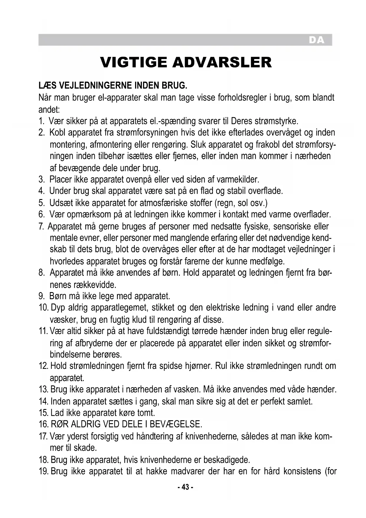 19. Brug ikke apparatet til at hakke madvarer der har en for hård konsistens (forDA