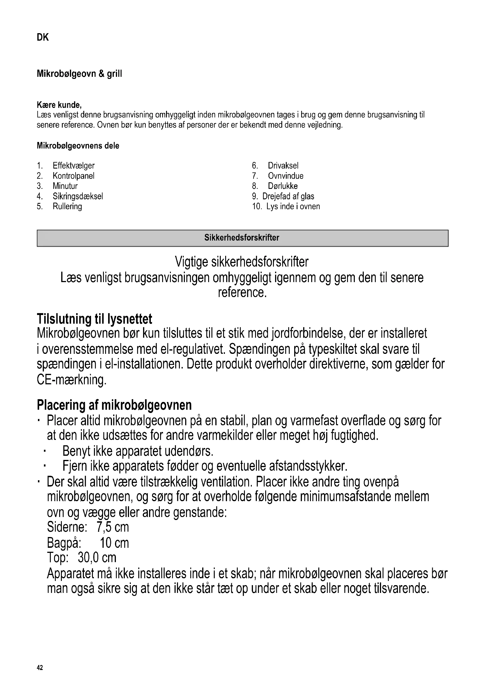 Sikkerhedsforskrifter Vigtige sikkerhedsforskrifter Læs venligst brugsanvisningen omhyggeligt igennem og gem den til senere reference. Tilslutning til lysnettet Mikrobølgeovnen bør kun tilsluttes til et stik med jordforbindelse, der er installeret i overensstemmelse med el-regulativet. Spændingen på typeskiltet skal svare til spændingen i el-installationen. Dette produkt overholder direktiverne, som gælder for CE-mærkning. Placering af mikrobølgeovnen ∙ Placer altid mikrobølgeovnen på en stabil, plan og varmefast overade og sørg for at den ikke udsættes for andre varmekilder eller meget høj fugtighed. ∙ Benyt ikke apparatet udendørs. ∙ Fjern ikke apparatets fødder og eventuelle afstandsstykker. ∙ Der skal altid være tilstrækkelig ventilation. Placer ikke andre ting ovenpå mikrobølgeovnen, og sørg for at overholde følgende minimumsafstande mellem ovn og vægge eller andre genstande: Siderne: 7,5 cm Bagpå: 10 cm Top: 30,0 cm Apparatet må ikke installeres inde i et skab; når mikrobølgeovnen skal placeres bør man også sikre sig at den ikke står tæt op under et skab eller noget tilsvarende.43 142 x 208 mm Vigtige noter ∙ Advarsel: Nogle typer af fødevarer er letantændelige. Efterlad ikke tilsluttede apparater uden opsyn. ∙ Denne mikrobølgeovn er kun beregnet til optøning, opvarmning eller tilberedning af mad. Advarsel: Forsøg aldrig på at tørre mad eller tøj, eller på at opvarme varmepuder, indesko, svampe, våde rengøringsklude el. lign., da dette kan forårsage tilskadekomst, brandsår eller brand. ∙ Ansvar accepteres ikke, hvis ødelæggelse skyldes ukorrekt brug, eller hvis denne brugsanvisning ikke er fulgt. ∙ Brug kun tallerkener, der er egnet til mikrobølgeovn. Brug ikke metalbeholdere til at opvarme mad og drikkevarer i mikrobølgeovnen. For detaljeret information, se venligst afsnittet ’Benyt altid velegnede køkkenredskaber’. ∙ Apparatet er ikke beregnet til brug ved hjælp af en ekstern timer eller et separat fjernstyringssystem. ∙ Dette apparat kan benyttes af børn (som er mindst 8 år) og af personer med reducerede fysiske, sensoriske eller mentale evner, eller mangel på erfaring eller viden, såfremt de har fået vejledning og instruktion i brugen af dette apparat og fuldt ud forstår alle farer og forholdsregler vedrørende sikkerheden som brug af apparatet medfører. ∙ Børn må aldrig få lov til at lege med apparatet. ∙ Børn bør aldrig få lov til at udføre rengørings- eller vedligeholdelsesarbejde på apparatet, medmindre de er under opsyn. ∙ Apparatet og dets ledning må altid holdes væk fra børn som er yngre en 8 år. ∙ For at undgå elektrisk stød bør apparatet ikke rengøres med vand og heller ikke nedsænkes i vand. ∙ Rengør ikke apparatet med en damprenser. ∙ Sluk altid apparatet og tag stikket ud af stikkontakten: - inden rengøring, - tilfælde af fejlfunktion. - efter brug. ∙ Træk aldrig i selve ledningen, når ledningen tages ud af stikkontakten; tag altid fat i selve stikket. Rør aldrig ved strømstikket med våde hænder.