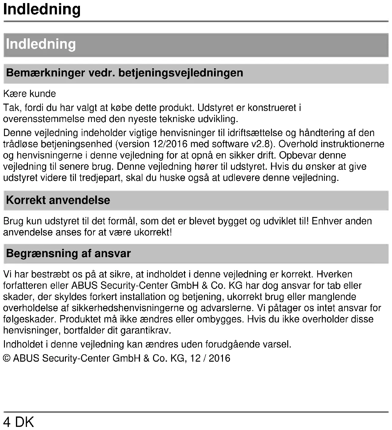 4 DK Indledning Bemærkninger vedr. betjeningsvejledningen Kære kunde Tak, fordi du har valgt at købe dette produkt. Udstyret er konstrueret i overensstemmelse med den nyeste tekniske udvikling. Denne vejledning indeholder vigtige henvisninger til idriftsættelse og håndtering af den trådløse betjeningsenhed (version 12/2016 med software v2.8). Overhold instruktionerne og henvisningerne i denne vejledning for at opnå en sikker drift. Opbevar denne vejledning til senere brug. Denne vejledning hører til udstyret. Hvis du ønsker at give udstyret videre til tredjepart, skal du huske også at udlevere denne vejledning. Korrekt anvendelse Brug kun udstyret til det formål, som det er blevet bygget og udviklet til! Enhver anden anvendelse anses for at være ukorrekt! Begrænsning af ansvar Vi har bestræbt os på at sikre, at indholdet i denne vejledning er korrekt. Hverken forfatteren eller ABUS Security-Center GmbH & Co. KG har dog ansvar for tab eller skader, der skyldes forkert installation og betjening, ukorrekt brug eller manglende overholdelse af sikkerhedshenvisningerne og advarslerne. Vi påtager os intet ansvar for følgeskader. Produktet må ikke ændres eller ombygges. Hvis du ikke overholder disse henvisninger, bortfalder dit garantikrav. Indholdet i denne vejledning kan ændres uden forudgående varsel. © ABUS Security-Center GmbH & Co. KG, 12 / 2016Sikkerhedsanvisninger