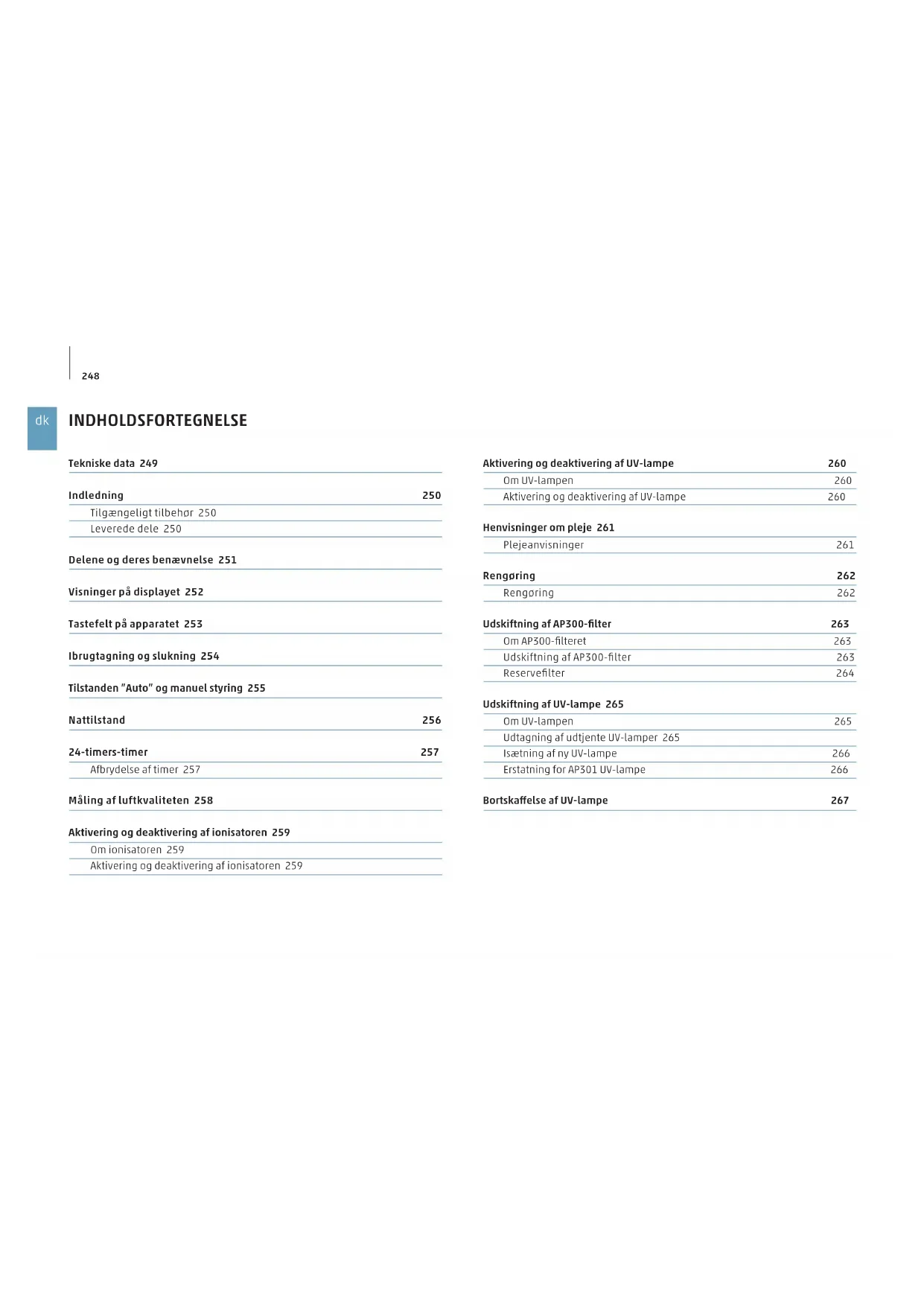 INDHOLDSFORTEGNELSE Tekniske data 249 Indledning 250 Tilgængeligt tilbehør 250 Leverede dele 250 Delene og deres benævnelse 251 Visninger på displayet 252 Tastefelt på apparatet 253 Ibrugtagning og slukning 254 Tilstanden ”Auto” og manuel styring 255 Nattilstand 256 24-timers-timer 257 Afbrydelse af timer 257 Måling af luftkvaliteten 258 Aktivering og deaktivering af ionisatoren 259 Om ionisatoren 259 Aktivering og deaktivering af ionisatoren 259 Aktivering og deaktivering af UV-lampe 260 Om UV-lampen 260 Aktivering og deaktivering af UV-lampe 260 Henvisninger om pleje 261 Plejeanvisninger 261 Rengøring 262 Rengøring 262 Udskiftning af AP300-filter 263 Om AP300-filteret 263 Udskiftning af AP300-filter 263 Reservefilter 264 Udskiftning af UV-lampe 265 Om UV-lampen 265 Udtagning af udtjente UV-lamper 265 Isætning af ny UV-lampe 266 Erstatning for AP301 UV-lampe 266 Bortskaelse af UV-lampe 267249