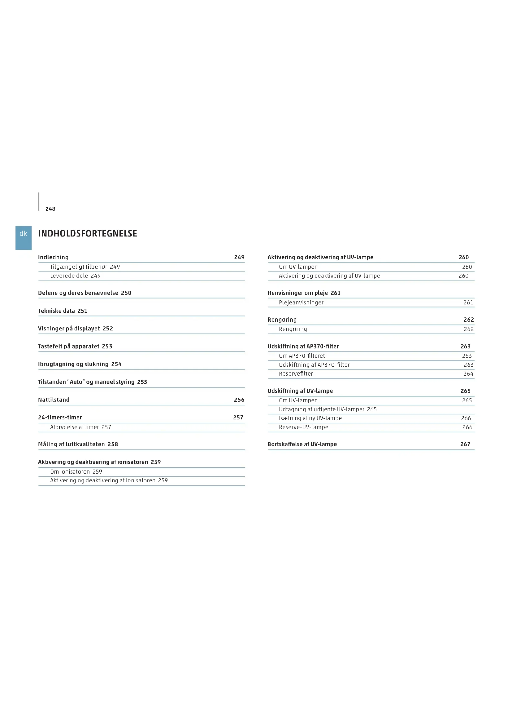 INDHOLDSFORTEGNELSE Indledning 249 Tilgængeligt tilbehør 249 Leverede dele 249 Delene og deres benævnelse 250 Tekniske data 251 Visninger på displayet 252 Tastefelt på apparatet 253 Ibrugtagning og slukning 254 Tilstanden ”Auto” og manuel styring 255 Nattilstand 256 24-timers-timer 257 Afbrydelse af timer 257 Måling af luftkvaliteten 258 Aktivering og deaktivering af ionisatoren 259 Om ionisatoren 259 Aktivering og deaktivering af ionisatoren 259 Aktivering og deaktivering af UV-lampe 260 Om UV-lampen 260 Aktivering og deaktivering af UV-lampe 260 Henvisninger om pleje 261 Plejeanvisninger 261 Rengøring 262 Rengøring 262 Udskiftning af AP370-filter 263 Om AP370-filteret 263 Udskiftning af AP370-filter 263 Reservefilter 264 Udskiftning af UV-lampe 265 Om UV-lampen 265 Udtagning af udtjente UV-lamper 265 Isætning af ny UV-lampe 266 Reserve-UV-lampe 266 Bortskaelse af UV-lampe 267249