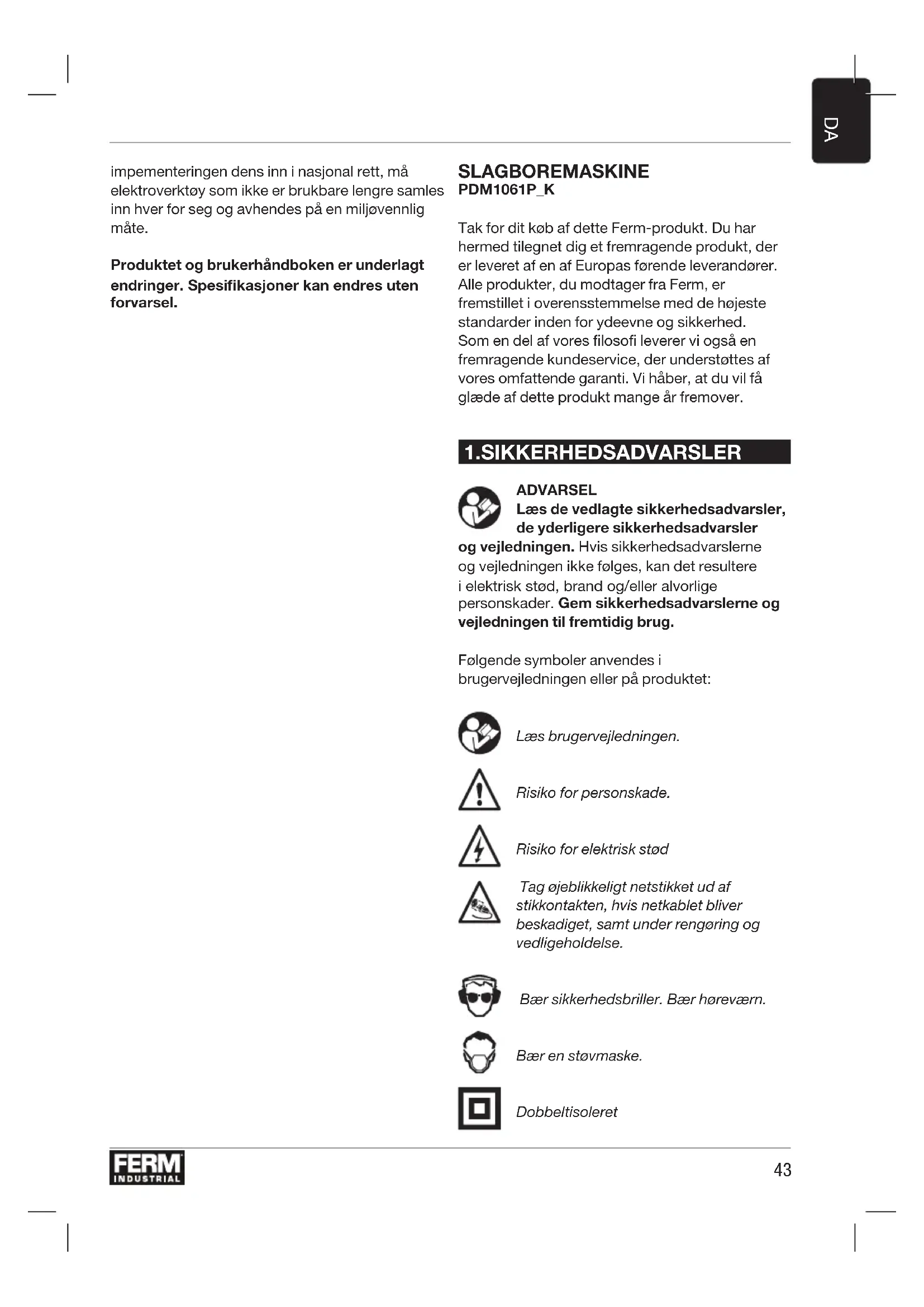 Tak for dit køb af dette Ferm-produkt. Du har hermed tilegnet dig et fremragende produkt, der er leveret af en af Europas førende leverandører. Alle produkter, du modtager fra Ferm, er fremstillet i overensstemmelse med de højeste standarder inden for ydeevne og sikkerhed. Som en del af vores filosofi leverer vi også en fremragende kundeservice, der understøttes af vores omfattende garanti. Vi håber, at du vil få glæde af dette produkt mange år fremover.