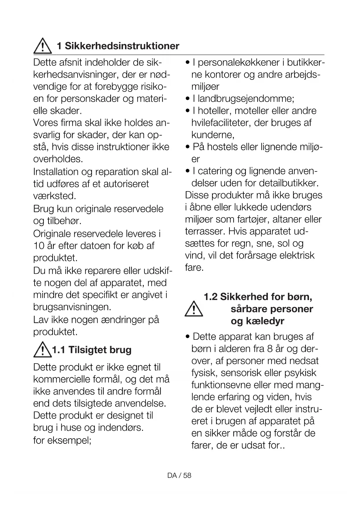 SVDA / 58 1 Sikkerhedsinstruktioner Dette afsnit indeholder de sik- kerhedsanvisninger, der er nød- vendige for at forebygge risiko- en for personskader og materi- elle skader. Vores firma skal ikke holdes an- svarlig for skader, der kan op- stå, hvis disse instruktioner ikke overholdes. Installation og reparation skal al- tid udføres af et autoriseret værksted. Brug kun originale reservedele og tilbehør. Originale reservedele leveres i 10 år efter datoen for køb af produktet. Du må ikke reparere eller udskif- te nogen del af apparatet, med mindre det specifikt er angivet i brugsanvisningen. Lav ikke nogen ændringer på produktet.