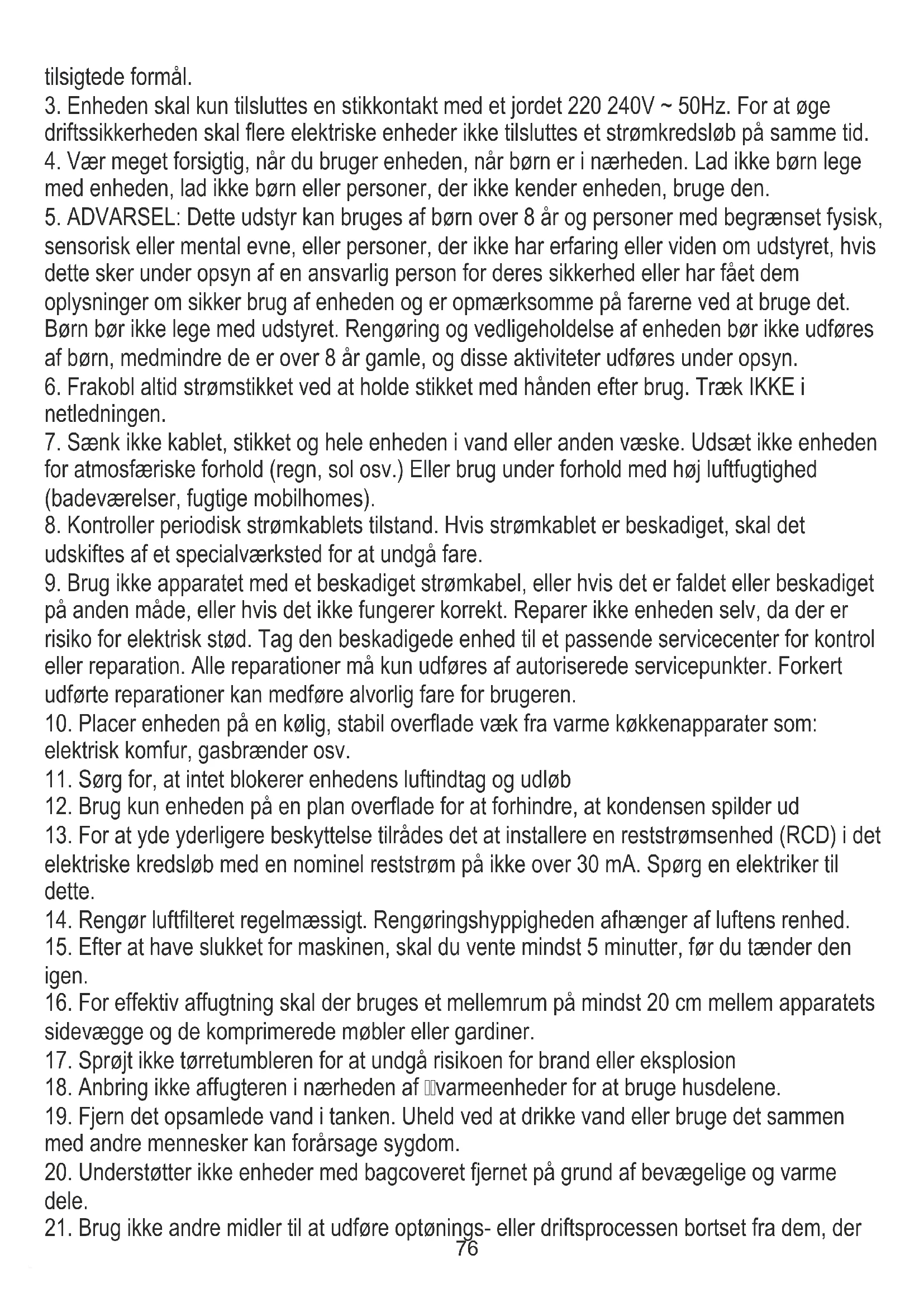 16. For effektiv affugtning skal der bruges et mellemrum på mindst 20 cm mellem apparatets