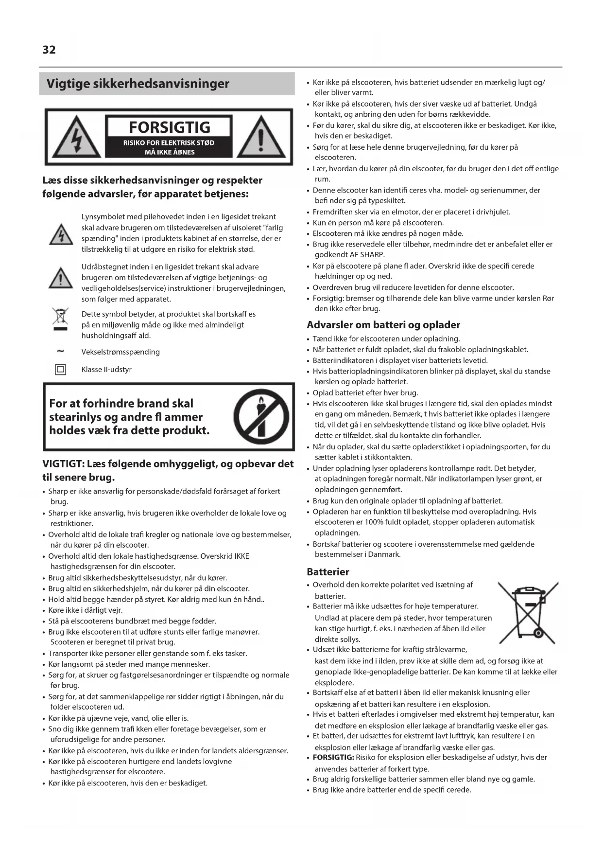 - Sharp er ikke ansvarlig for personskade/dødsfald forårsaget af forkert brug.• Sharp er ikke ansvarlig, hvis brugeren ikke overholder de lokale love og restriktioner.• Overhold altid de lokale tra kregler og nationale love og bestemmelser, når du kører på din elscooter.• Overhold altid den lokale hastighedsgrænse. Overskrid IKKE hastighedsgrænsen for din elscooter.• Brug altid sikkerhedsbeskyttelsesudstyr, når du kører.• Brug altid en sikkerhedshjelm, når du kører på din elscooter.• Hold altid begge hænder på styret. Kør aldrig med kun én hånd..• Køre ikke i dårligt vejr.• Stå på elscooterens bundbræt med begge fødder.• Brug ikke elscooteren til at udføre stunts eller farlige manøvrer. Scooteren er beregnet til privat brug.• Transporter ikke personer eller genstande som f. eks tasker.• Kør langsomt på steder med mange mennesker.• Sørg for, at skruer og fastgørelsesanordninger er tilspændte og normale før brug.• Sørg for, at det sammenklappelige rør sidder rigtigt i åbningen, når du folder elscooteren ud.• Kør ikke på ujævne veje, vand, olie eller is.• Sno dig ikke gennem tra kken eller foretage bevægelser, som er uforudsigelige for andre personer.• Kør ikke på elscooteren, hvis du ikke er inden for landets aldersgrænser.• Kør ikke på elscooteren hurtigere end landets lovgivne hastighedsgrænser for elscootere.• Kør ikke på elscooteren, hvis den er beskadiget.• Kør ikke på elscooteren, hvis batteriet udsender en mærkelig lugt og/eller bliver varmt.• Kør ikke på elscooteren, hvis der siver væske ud af batteriet. Undgå kontakt, og anbring den uden for børns rækkevidde.• Før du kører, skal du sikre dig, at elscooteren ikke er beskadiget. Kør ikke, hvis den er beskadiget.• Sørg for at læse hele denne brugervejledning, før du kører på elscooteren.• Lær, hvordan du kører på din elscooter, før du bruger den i det o entlige rum.
