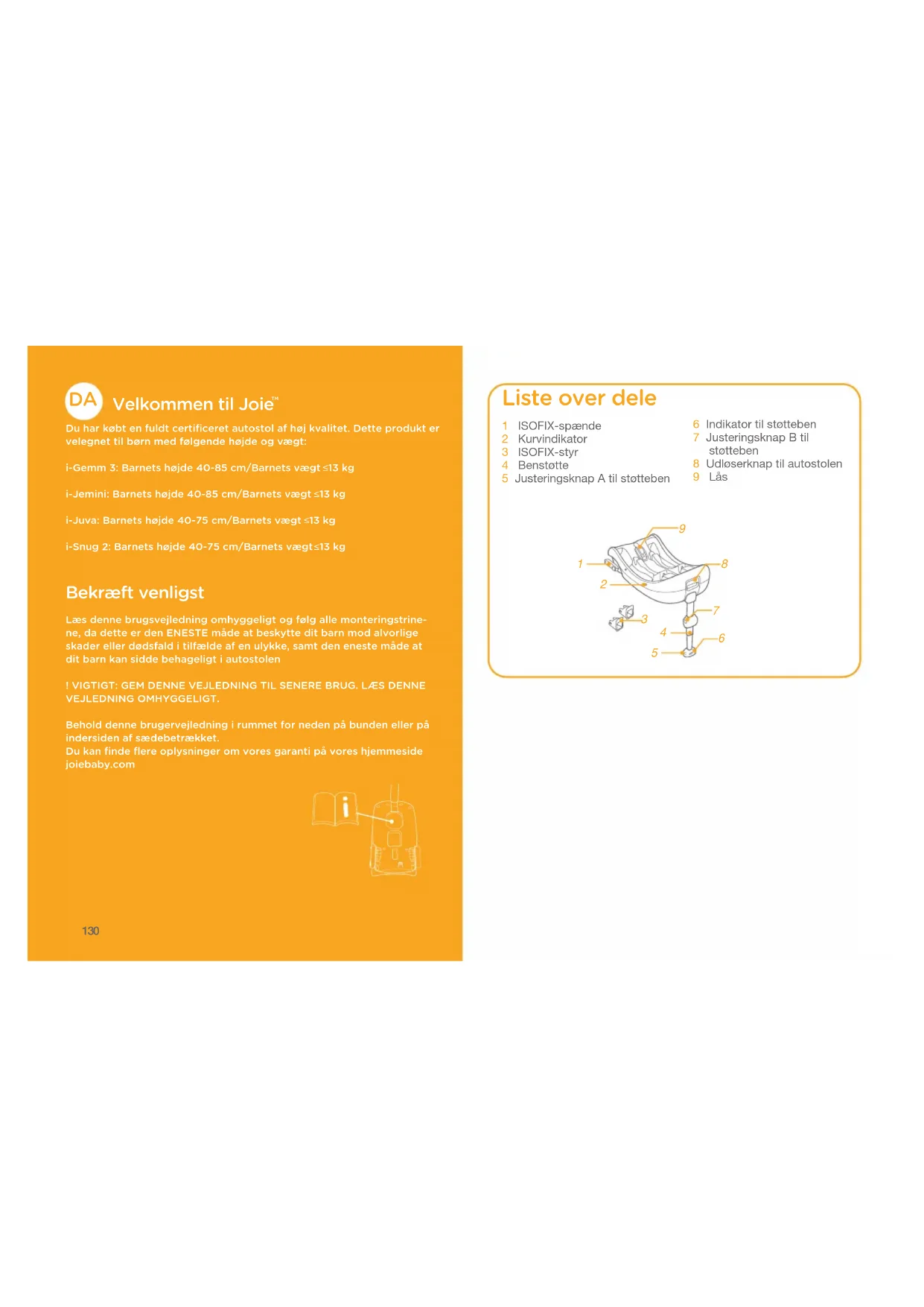 Du har købt en fuldt certificeret autostol af høj kvalitet. Dette produkt er velegnet til børn med følgende højde og vægt:i-Gemm 3: Barnets højde 40-85 cm/Barnets vægt 13 kgi-Jemini: Barnets højde 40-85 cm/Barnets vægt 13 kgi-Juva: Barnets højde 40-75 cm/Barnets vægt 13 kgi-Snug 2: Barnets højde 40-75 cm/Barnets vægt 13 kg Bekræft venligst Læs denne brugsvejledning omhyggeligt og følg alle monteringstrine-ne, da dette er den ENESTE måde at beskytte dit barn mod alvorlige skader eller dødsfald i tilfælde af en ulykke, samt den eneste måde at dit barn kan sidde behageligt i autostolen! VIGTIGT: GEM DENNE VEJLEDNING TIL SENERE BRUG. LÆS DENNE VEJLEDNING OMHYGGELIGT.Behold denne brugervejledning i rummet for neden på bunden eller på indersiden af sædebetrækket.Du kan finde flere oplysninger om vores garanti på vores hjemmeside joiebaby.com 6 Indikator til støtteben 7 Justeringsknap B til støtteben 8 Udløserknap til autostolen 9 Lås