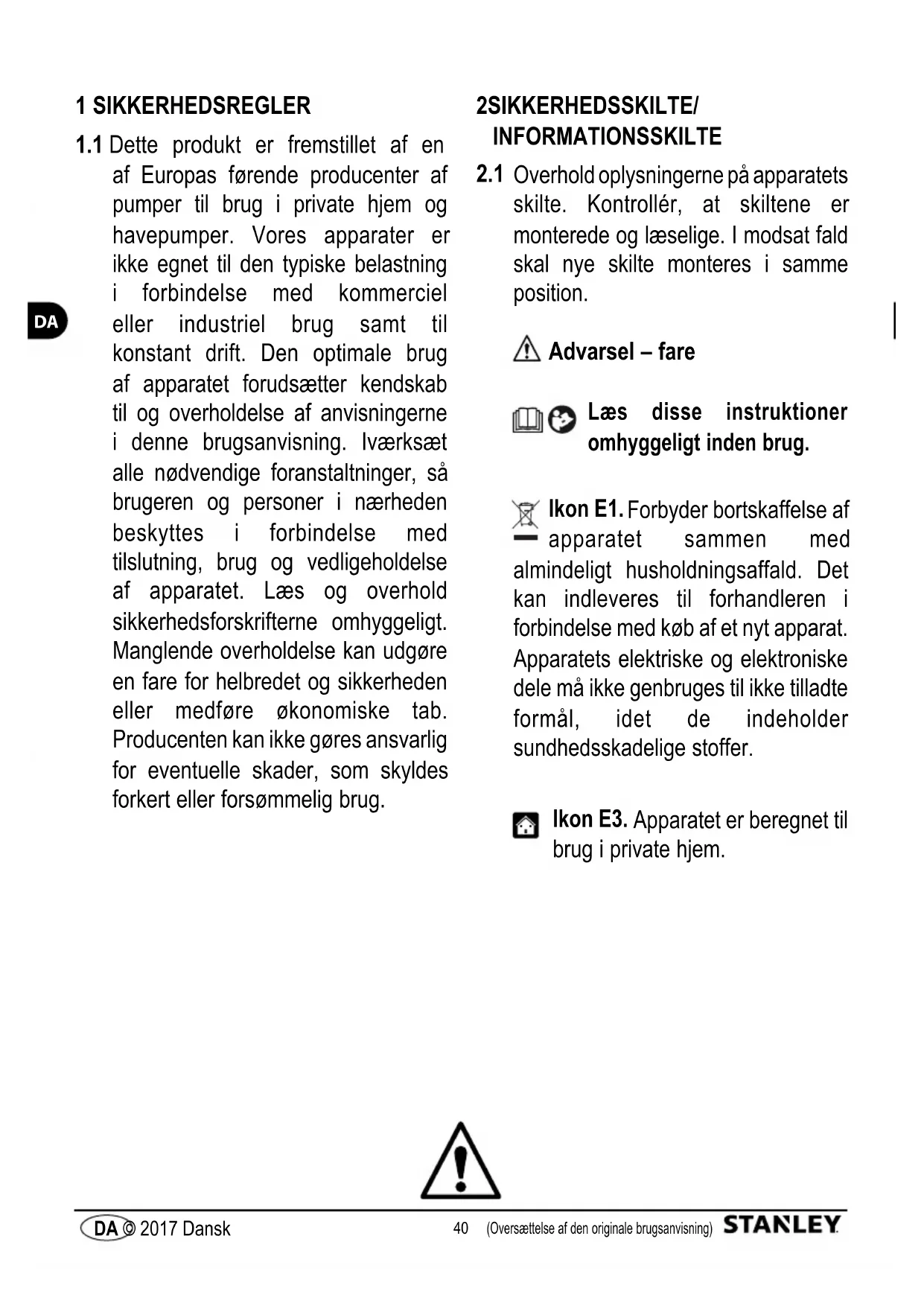 Overhold oplysningerne på apparatets skilte. Kontrollér, at skiltene er monterede og læselige. I modsat fald skal nye skilte monteres i samme position. Advarsel – fare Læs disse instruktioner omhyggeligt inden brug. Ikon E1. Forbyder bortskaffelse af apparatet sammen med almindeligt husholdningsaffald. Det kan indleveres til forhandleren i forbindelse med køb af et nyt apparat. Apparatets elektriske og elektroniske dele må ikke genbruges til ikke tilladte formål, idet de indeholder sundhedsskadelige stoffer. Ikon E3. Apparatet er beregnet til brug i private hjem.41 (Oversættelse af den originale brugsanvisning) DA © 2017 Dansk
