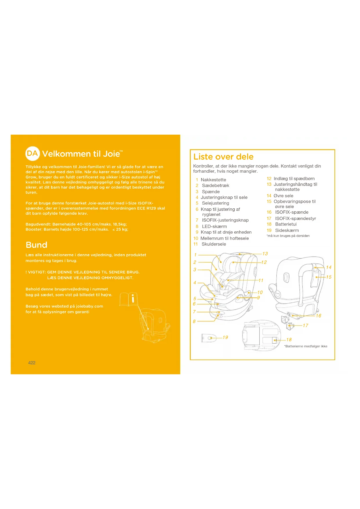 Tillykke og velkommen til Joie-familien! Vi er så glade for at være en del af din rejse med den lille. Når du kører med autostolen i-Spin™ Grow, bruger du en fuldt certificeret og sikker i-Size autostol af høj kvalitet. Læs denne vejledning omhyggeligt og følg alle trinene så du sikrer, at dit barn har det behageligt og er ordentligt beskyttet under turen.For at bruge denne forstærket Joie-autostol med i-Size ISOFIX-spænder, der er i overensstemmelse med forordningen ECE R129 skal dit barn opfylde følgende krav.Bagudvendt: Børnehøjde 40-105 cm/maks. 18,5kg;Booster: Barnets højde 100-125 cm/maks. 25 kg; Bund Læs alle instruktionerne i denne vejledning, inden produktet monteres og tages i brug.! VIGTIGT: GEM DENNE VEJLEDNING TIL SENERE BRUG.LÆS DENNE VEJLEDNING OMHYGGELIGT.Behold denne brugervejledning i rummet bag på sædet, som vist på billedet til højre.Besøg vores websted på joiebaby.com for at få oplysninger om garanti Liste over dele 1 Nakkestøtte 2 Sædebetræk 3 Spænde 4 Justeringsknap til sele 5 Selejustering 6 Knap til justering af ryglænet 7 ISOFIX-justeringsknap 8 LED-skærm 9 Knap til at dreje enheden10 Mellemrum til hoftesele11 Skuldersele12 Indlæg til spædbørn13 Justeringshåndtag til nakkestøtte14 Øvre sele15 Opbevaringspose til øvre sele16 ISOFIX-spænde17 ISOFIX-spændestyr18 Batterietui19 SideskærmKontroller, at der ikke mangler nogen dele. Kontakt venligst din forhandler, hvis noget mangler.