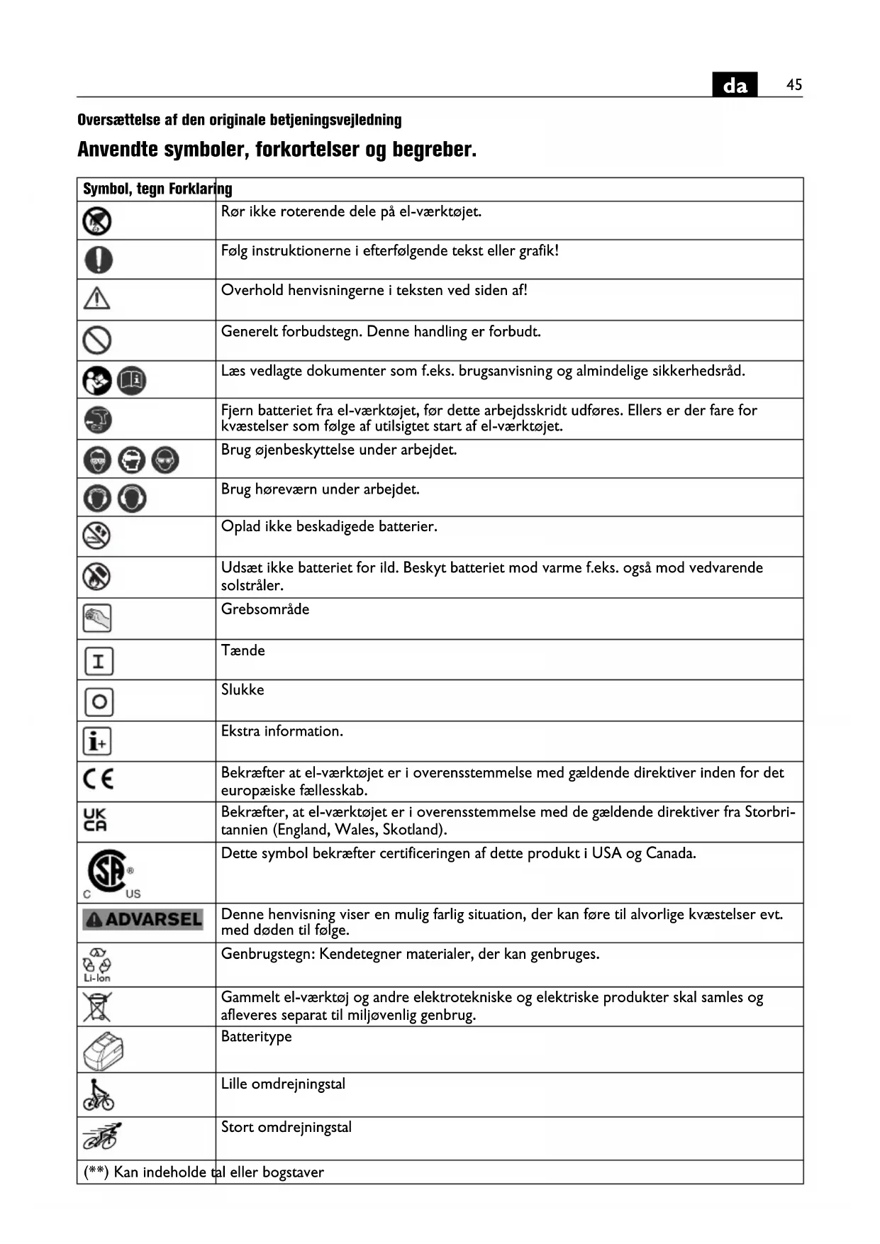 Oversættelse af den originale betjeningsvejledning Anvendte symboler, forkortelser og begreber. Symbol, tegn Forklaring Rør ikke roterende dele på el-værktøjet. Følg instruktionerne i efterfølgende tekst eller grafik! Overhold henvisningerne i teksten ved siden af! Generelt forbudstegn. Denne handling er forbudt. Læs vedlagte dokumenter som f.eks. brugsanvisning og almindelige sikkerhedsråd. Fjern batteriet fra el-værktøjet, før dette arbejdsskridt udføres. Ellers er der fare for kvæstelser som følge af utilsigtet start af el-værktøjet. Brug øjenbeskyttelse under arbejdet. Brug høreværn under arbejdet. Oplad ikke beskadigede batterier. Udsæt ikke batteriet for ild. Beskyt batteriet mod varme f.eks. også mod vedvarende solstråler. Grebsområde Tænde Slukke Ekstra information. Bekræfter at el-værktøjet er i overensstemmelse med gældende direktiver inden for det europæiske fællesskab. Bekræfter, at el-værktøjet er i overensstemmelse med de gældende direktiver fra Storbri- tannien (England, Wales, Skotland). Dette symbol bekræfter certificeringen af dette produkt i USA og Canada. Denne henvisning viser en mulig farlig situation, der kan føre til alvorlige kvæstelser evt. med døden til følge. Genbrugstegn: Kendetegner materialer, der kan genbruges. Gammelt el-værktøj og andre elektrotekniske og elektriske produkter skal samles og afleveres separat til miljøvenlig genbrug. Batteritype Lille omdrejningstal Stort omdrejningstal (**) Kan indeholde tal eller bogstaver46