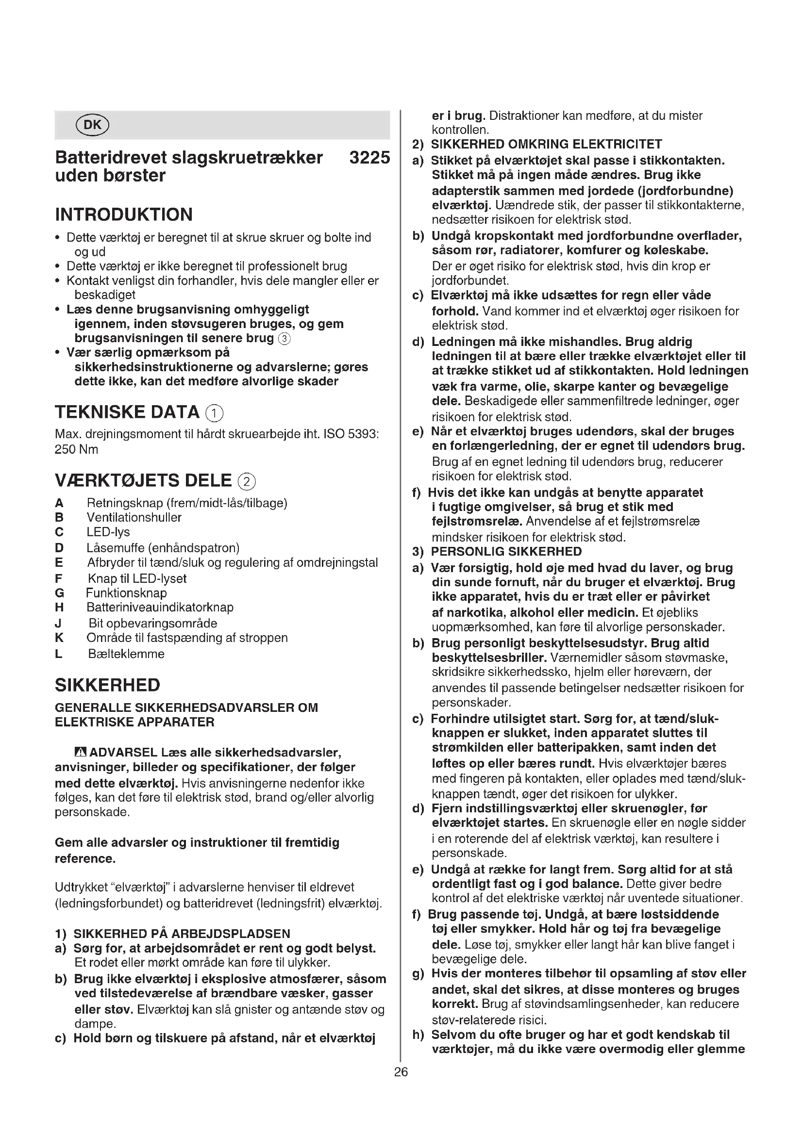 - Vær særlig opmærksom på sikkerhedsinstruktionerne og advarslerne; gøres dette ikke, kan det medføre alvorlige skader TEKNISKE DATA 1 Max. drejningsmoment til hårdt skruearbejde iht. ISO 5393: 250 Nm