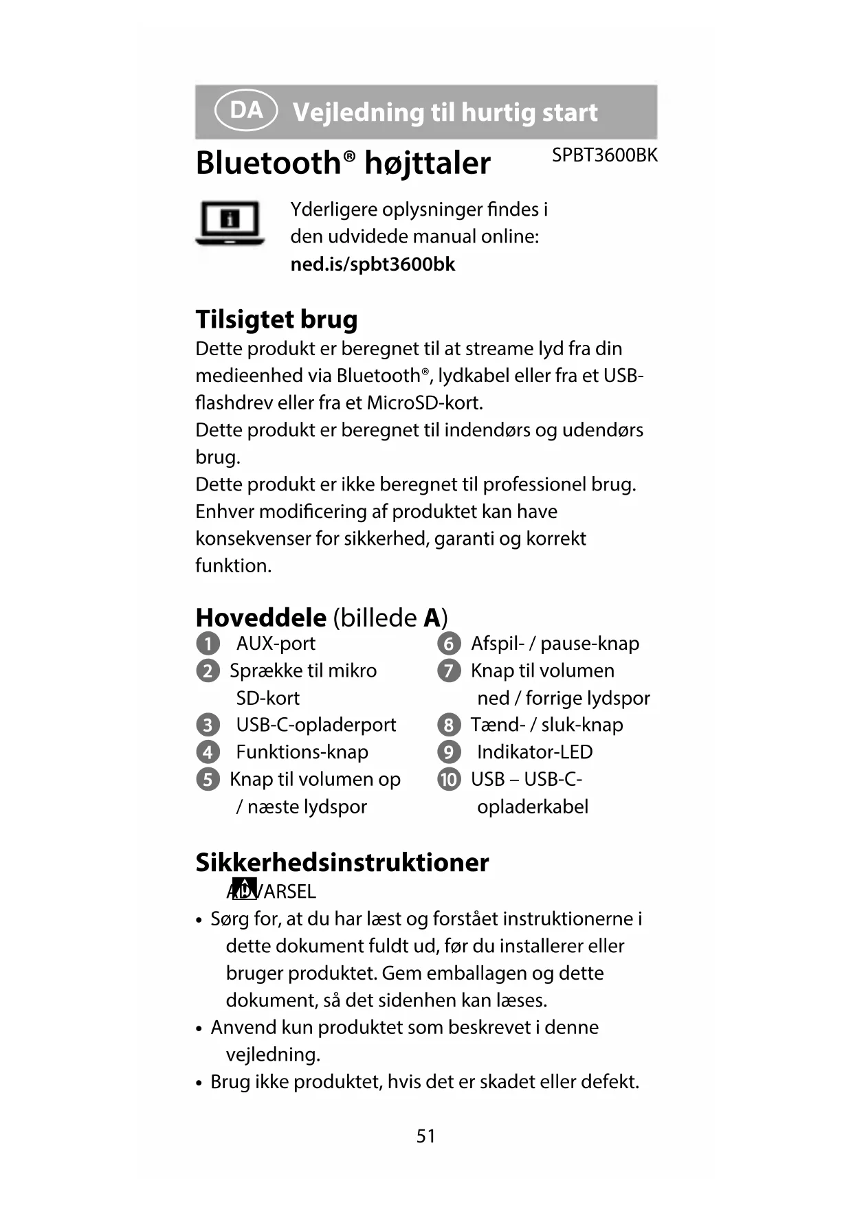 Vejledning til hurtig start Bluetooth® højttaler SPBT3600BKYderligere oplysninger ndes i den udvidede manual online: ned.is/spbt3600bk Tilsigtet brug Dette produkt er beregnet til at streame lyd fra din medieenhed via Bluetooth®, lydkabel eller fra et USB-ashdrev eller fra et MicroSD-kort.Dette produkt er beregnet til indendørs og udendørs brug.Dette produkt er ikke beregnet til professionel brug.Enhver modicering af produktet kan have konsekvenser for sikkerhed, garanti og korrekt funktion. Hoveddele (billede A) 1 AUX-port 2 Sprække til mikro SD-kort 3 USB-C-opladerport 4 Funktions-knap 5 Knap til volumen op / næste lydspor 6 Afspil- / pause-knap 7 Knap til volumen ned / forrige lydspor 8 Tænd- / sluk-knap 9 Indikator-LED q USB – USB-C- opladerkabel Sikkerhedsinstruktioner