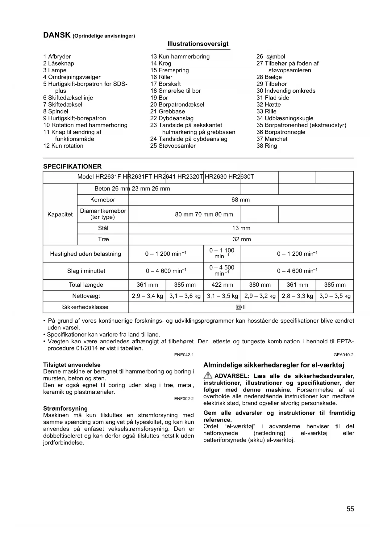 - Vægten kan være anderledes afhængigt af tilbehøret. Den letteste og tungeste kombination i henhold til EPTA- procedure 01/2014 er vist i tabellen. ENE042-1 Tilsigtet anvendelse Denne maskine er beregnet til hammerboring og boring i mursten, beton og sten. Den er også egnet til boring uden slag i træ, metal, keramik og plastmaterialer. ENF002-2 Strømforsyning Maskinen må kun tilsluttes en strømforsyning med samme spænding som angivet på typeskiltet, og kan kun anvendes på enfaset vekselstrømsforsyning. Den er dobbeltisoleret og kan derfor også tilsluttes netstik uden jordforbindelse. GEA010-2 Almindelige sikkerhedsregler for el-værktøj ADVARSEL: Læs alle de sikkerhedsadvarsler, instruktioner, illustrationer og specifikationer, der følger med denne maskine. Forsømmelse af at overholde alle nedenstående instruktioner kan medføre elektrisk stød, brand og/eller alvorlig personskade. Gem alle advarsler og instruktioner til fremtidig reference. Ordet “el-værktøj” i advarslerne henviser til det netforsynede (netledning) el-værktøj eller batteriforsynede (akku) el-værktøj. Model HR2631F HR2631FT HR2641 HR2320T HR2630 HR2630T Kapacitet Beton 26 mm 23 mm 26 mm Kernebor 68 mm Diamantkernebor (tør type) 80 mm 70 mm 80 mm Stål 13 mm Træ 32 mm Hastighed uden belastning 0 – 1 200 min