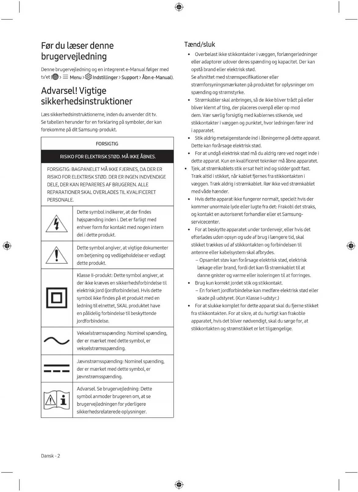 - Batteriets typ kan variera beroende på modell. Svenska - 9 SvenskaFør du læser denne brugervejledning Denne brugervejledning og en integreret e-Manual følger med tv’et ( > Menu > Indstillinger > Support > Åbn e-Manual). Advarsel! Vigtige sikkerhedsinstruktioner Læs sikkerhedsinstruktionerne, inden du anvender dit tv. Se tabellen herunder for en forklaring på symboler, der kan forekomme på dit Samsung-produkt. FORSIGTIG RISIKO FOR ELEKTRISK STØD. MÅ IKKE ÅBNES. FORSIGTIG: BAGPANELET MÅ IKKE FJERNES, DA DER ER RISIKO FOR ELEKTRISK STØD. DER ER INGEN INDVENDIGE DELE, DER KAN REPARERES AF BRUGEREN. ALLE