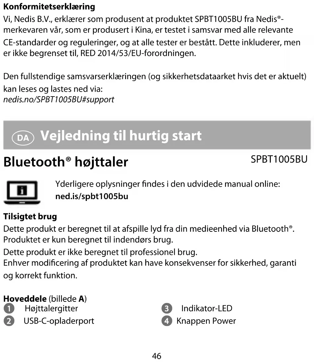 Vejledning til hurtig start Bluetooth® højttaler SPBT1005BU Yderligere oplysninger ndes i den udvidede manual online: ned.is/spbt1005bu Tilsigtet brug Dette produkt er beregnet til at afspille lyd fra din medieenhed via Bluetooth®. Produktet er kun beregnet til indendørs brug. Dette produkt er ikke beregnet til professionel brug. Enhver modicering af produktet kan have konsekvenser for sikkerhed, garanti og korrekt funktion. Hoveddele (billede A) 1 Højttalergitter 2 USB-C-opladerport 3 Indikator-LED 4 Knappen Power47 5 Knap til volumen ned/forrige lydspor 6 Afspil- / pause-knap 7 Telefonknap 8 Knap til volumen op/næste lydspor 9 Mikrofon q USB-C - USB-Kabel Sikkerhedsinstruktioner
