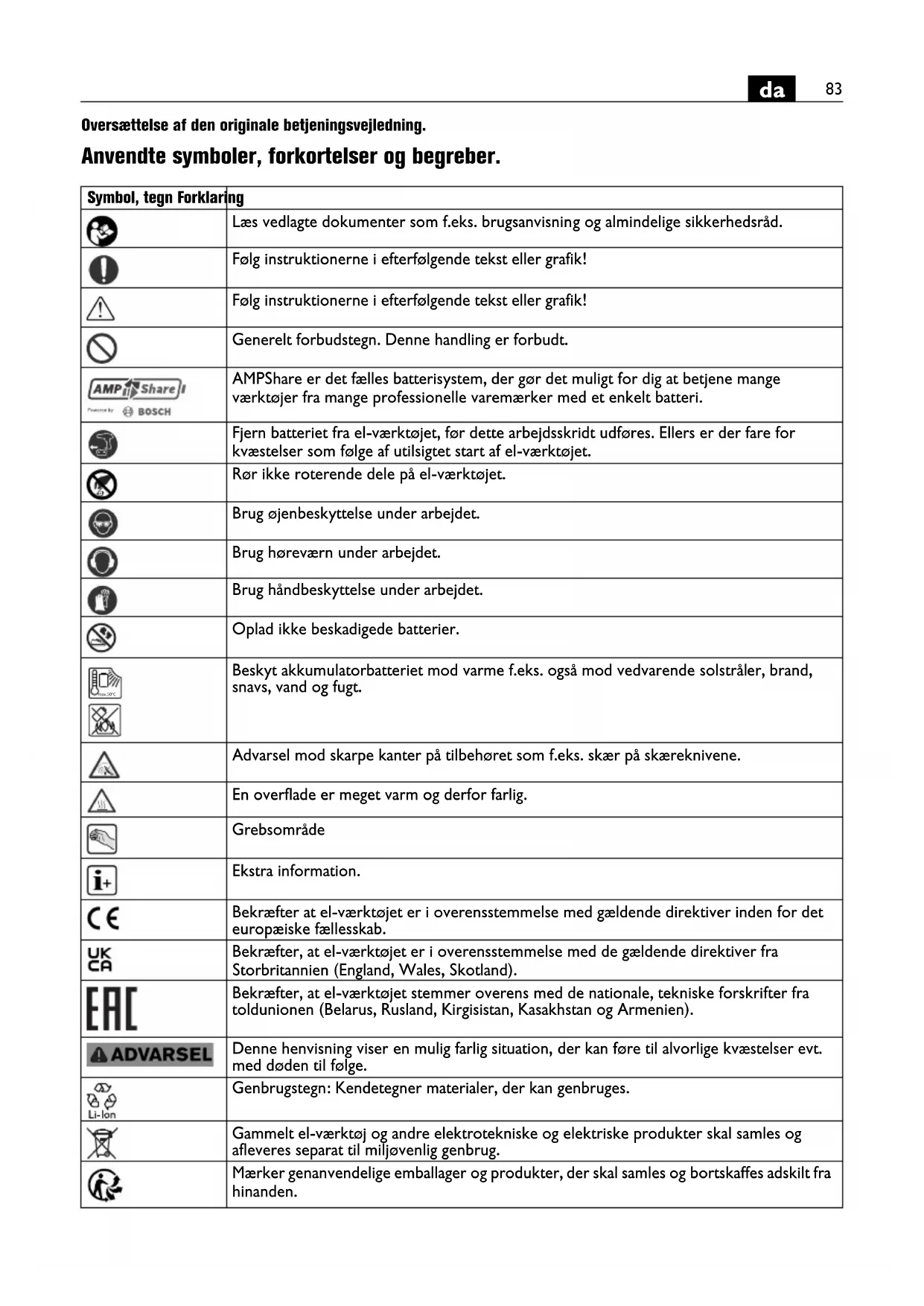 Oversættelse af den originale betjeningsvejledning. Anvendte symboler, forkortelser og begreber. Symbol, tegn Forklaring Læs vedlagte dokumenter som f.eks. brugsanvisning og almindelige sikkerhedsråd. Følg instruktionerne i efterfølgende tekst eller grafik! Følg instruktionerne i efterfølgende tekst eller grafik! Generelt forbudstegn. Denne handling er forbudt. AMPShare er det fælles batterisystem, der gør det muligt for dig at betjene mange værktøjer fra mange professionelle varemærker med et enkelt batteri. Fjern batteriet fra el-værktøjet, før dette arbejdsskridt udføres. Ellers er der fare for kvæstelser som følge af utilsigtet start af el-værktøjet. Rør ikke roterende dele på el-værktøjet. Brug øjenbeskyttelse under arbejdet. Brug høreværn under arbejdet. Brug håndbeskyttelse under arbejdet. Oplad ikke beskadigede batterier. Beskyt akkumulatorbatteriet mod varme f.eks. også mod vedvarende solstråler, brand, snavs, vand og fugt. Advarsel mod skarpe kanter på tilbehøret som f.eks. skær på skæreknivene. En overflade er meget varm og derfor farlig. Grebsområde Ekstra information. Bekræfter at el-værktøjet er i overensstemmelse med gældende direktiver inden for det europæiske fællesskab. Bekræfter, at el-værktøjet er i overensstemmelse med de gældende direktiver fra Storbritannien (England, Wales, Skotland). Bekræfter, at el-værktøjet stemmer overens med de nationale, tekniske forskrifter fra toldunionen (Belarus, Rusland, Kirgisistan, Kasakhstan og Armenien). Denne henvisning viser en mulig farlig situation, der kan føre til alvorlige kvæstelser evt. med døden til følge. Genbrugstegn: Kendetegner materialer, der kan genbruges. Gammelt el-værktøj og andre elektrotekniske og elektriske produkter skal samles og afleveres separat til miljøvenlig genbrug. Mærker genanvendelige emballager og produkter, der skal samles og bortskaffes adskilt fra hinanden. max.50°C84