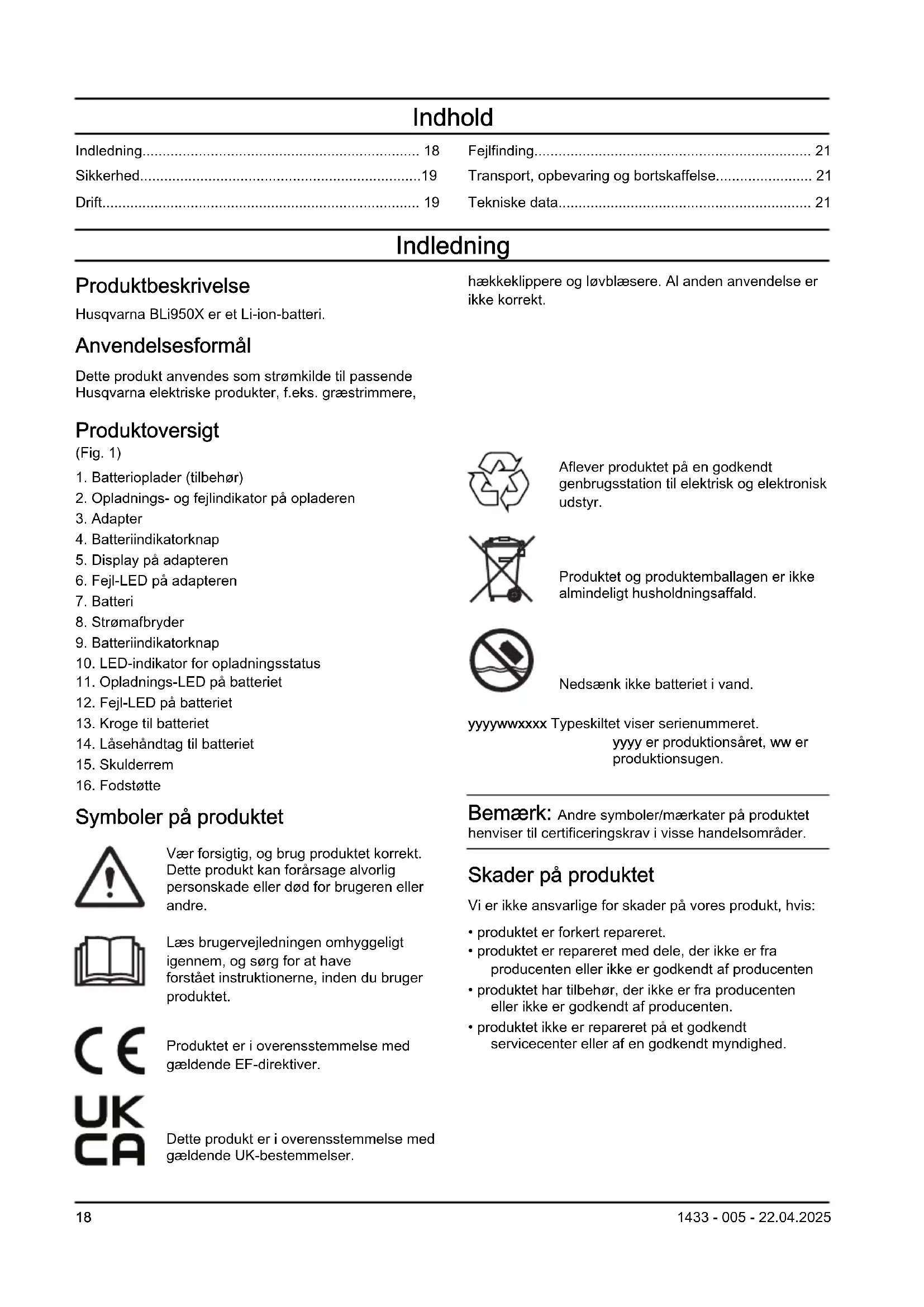 Symboler på produktet Vær forsigtig, og brug produktet korrekt. Dette produkt kan forårsage alvorlig personskade eller død for brugeren eller andre. Læs brugervejledningen omhyggeligt igennem, og sørg for at have forstået instruktionerne, inden du bruger produktet. Produktet er i overensstemmelse med gældende EF-direktiver. Dette produkt er i overensstemmelse med gældende UK-bestemmelser. Aflever produktet på en godkendt genbrugsstation til elektrisk og elektronisk udstyr. Produktet og produktemballagen er ikke almindeligt husholdningsaffald. Nedsænk ikke batteriet i vand. yyyywwxxxx Typeskiltet viser serienummeret. yyyy er produktionsåret, ww er produktionsugen. Bemærk: Andre symboler/mærkater på produktet henviser til certificeringskrav i visse handelsområder. Skader på produktet Vi er ikke ansvarlige for skader på vores produkt, hvis: