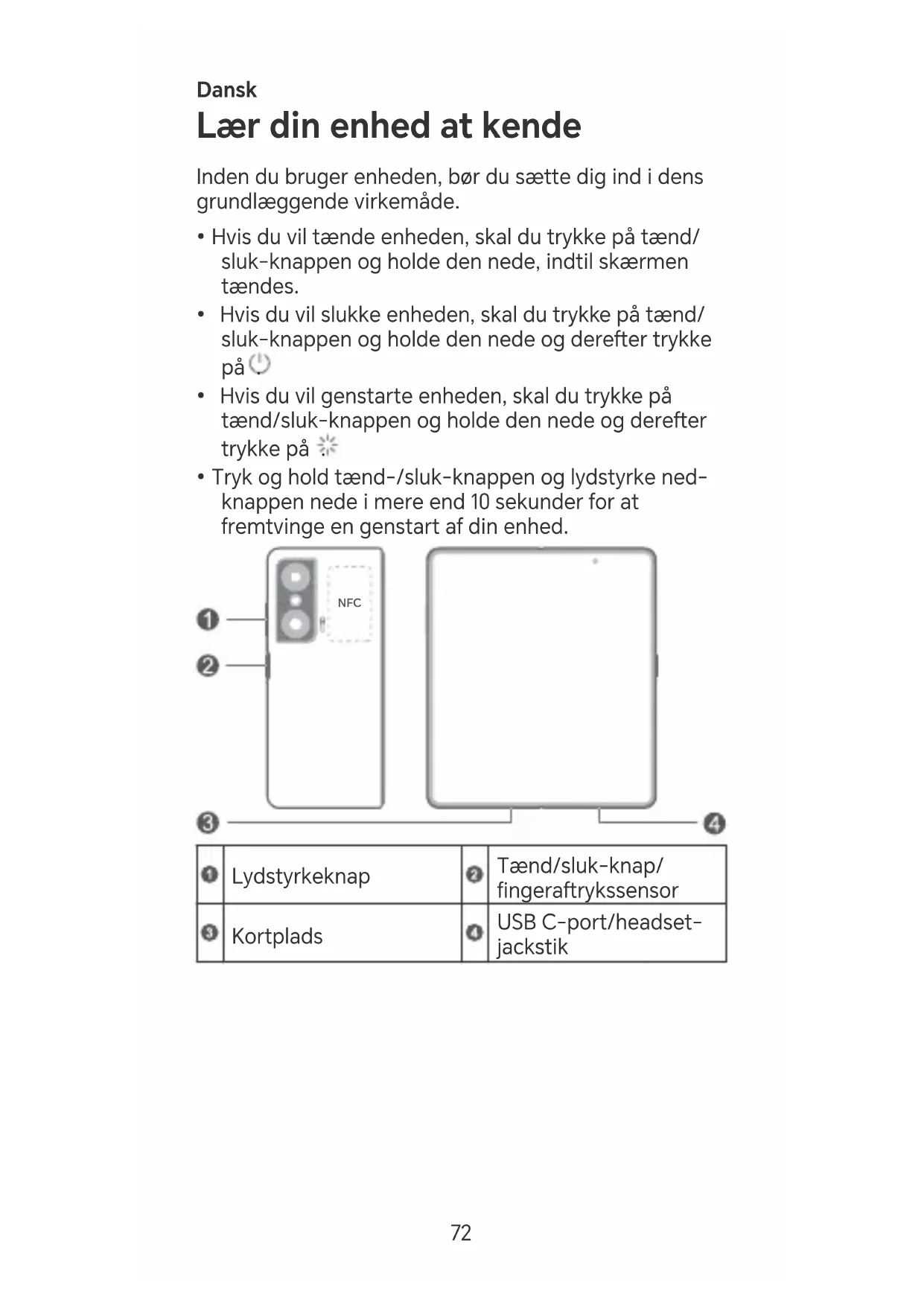 Lydstyrkeknap Tænd/sluk-knap/ ngeraftkssensor Koplads USB C-po/headset- jackstik 72• Hold NFC-området tæt på andre enheder eller genstande, når du bruger NFC-funktionen.