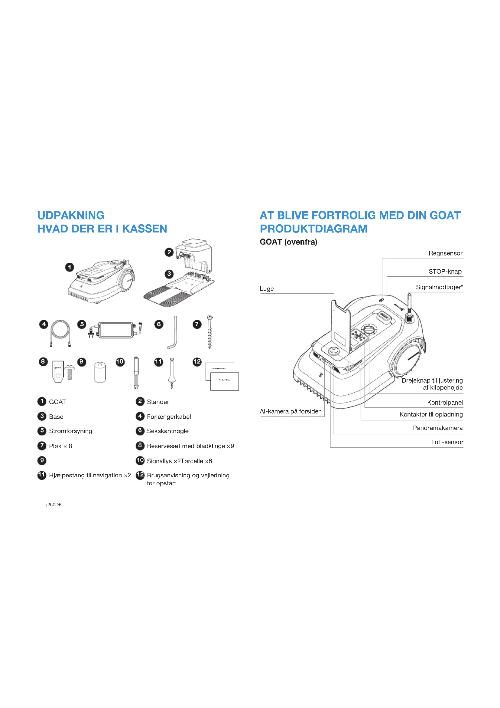 PRODUKTDIAGRAM GOAT (ovenfra) Regnsensor STOP-knap Signalmodtager* Drejeknap til justering af klippehøjde Kontrolpanel Kontakter til opladning Panoramakamera ToF-sensor Luge AI-kamera på forsiden GOAT Strømforsyning Forlængerkabel Reservesæt med bladklinge ×9 Brugsanvisning og vejledning før opstart Stander Sekskantnøgle Signallys ×2Tørcelle ×6 Base Pløk × 8 Hjælpestang til navigation ×2