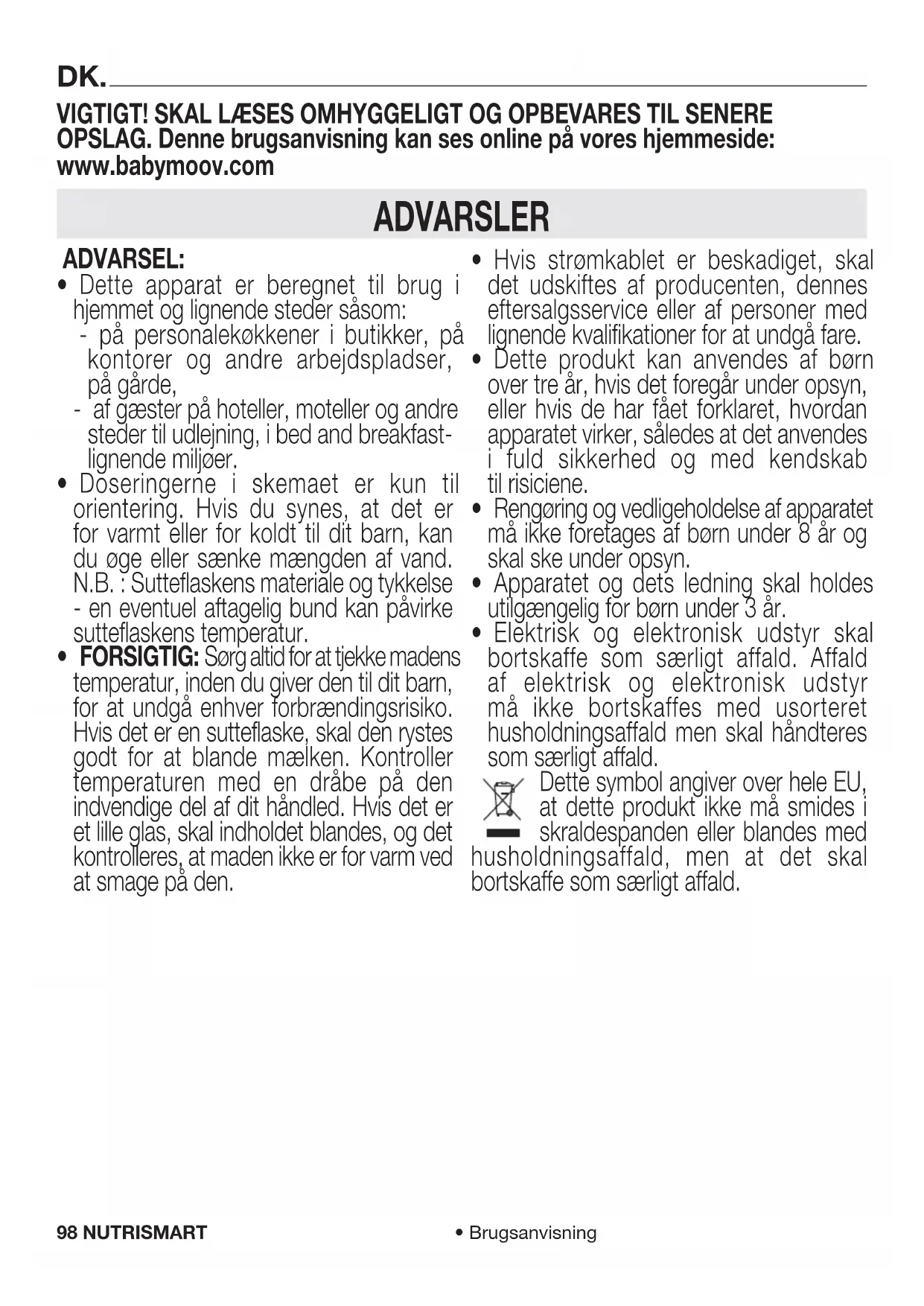 - Elektrisk og elektronisk udstyr skal bortskaffe som særligt affald. Affald af elektrisk og elektronisk udstyr må ikke bortskaffes med usorteret husholdningsaffald men skal håndteres som særligt affald. Dette symbol angiver over hele EU, at dette produkt ikke må smides i skraldespanden eller blandes med husholdningsaffald, men at det skal bortskaffe som særligt affald. VIGTIGT! SKAL LÆSES OMHYGGELIGT OG OPBEVARES TIL SENERE OPSLAG. Denne brugsanvisning kan ses online på vores hjemmeside: www.babymoov.com99NUTRISMART