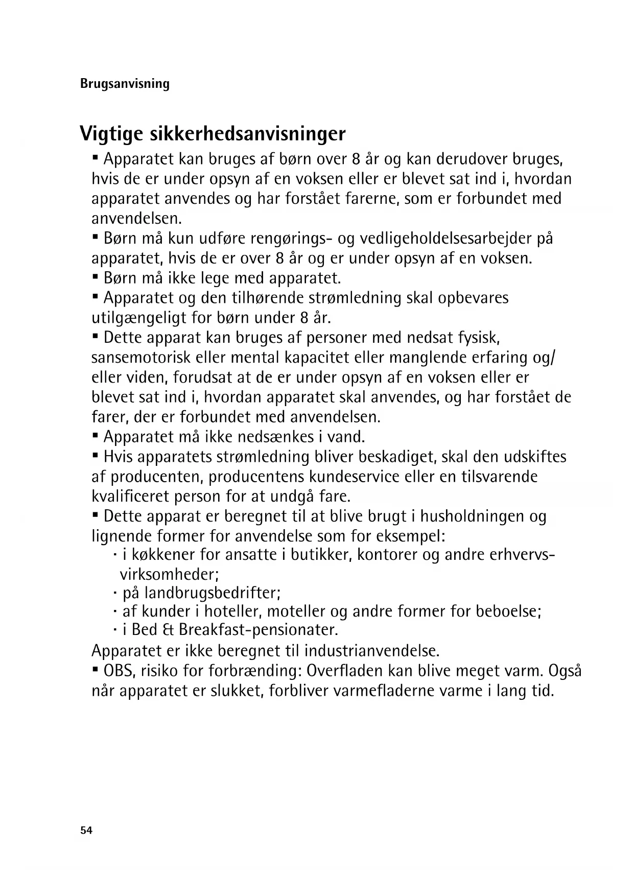 - Apparatet kan bruges af børn over 8 år og kan derudover bruges, hvis de er under opsyn af en voksen eller er blevet sat ind i, hvordan apparatet anvendes og har forstået farerne, som er forbundet med anvendelsen.