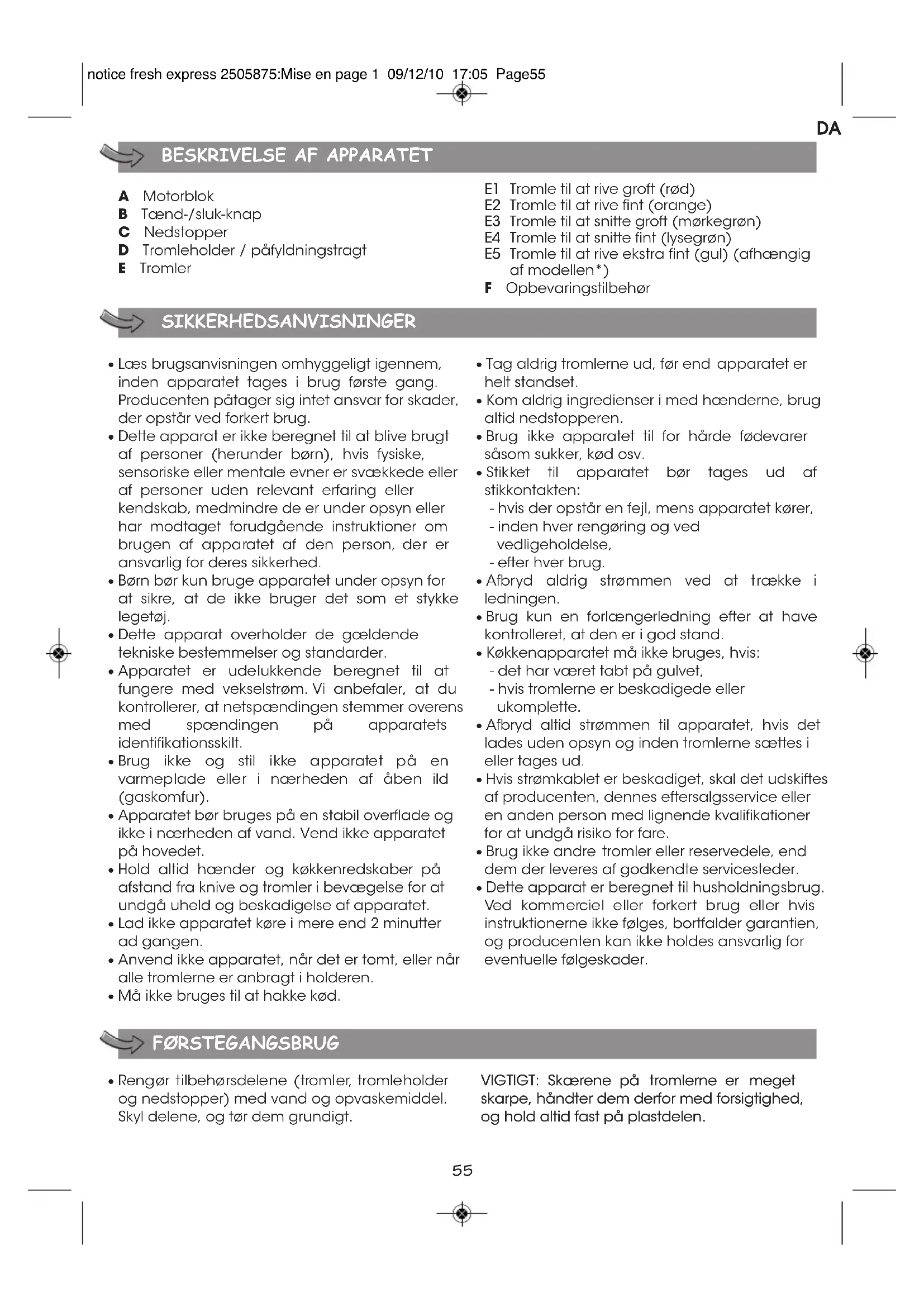 BORTSKAFFELSE AF BRUGT ELEKTRISK OG ELEKTRONISK UDSTYR: Dette apparat er beregnet til at holde i mange år. Men den dag, du beslutter dig for at udskifte det, må du ikke smide det ud sammen med det almindelige husholdningsaffald. Det skal afleveres på et specialiseret indsamlingscenter for genbrug, som kommunen stiller til rådighed (eller på en affaldsplads). Tænk på miljøet! Apparatet indeholder mange materialer, der kan genvindes eller genbruges. Bring det til et specialiseret indsamlingscenter for genbrug, når det ikke skal bruges mere. notice fresh express 2505875:Mise en page 1 09/12/10 17:05 Page5859 A Motorenhet B Strömbrytare C Påmatare D Trumhållare/matningsrör E Trummor BESKRIVNING SÄKERHETSANVISNINGAR