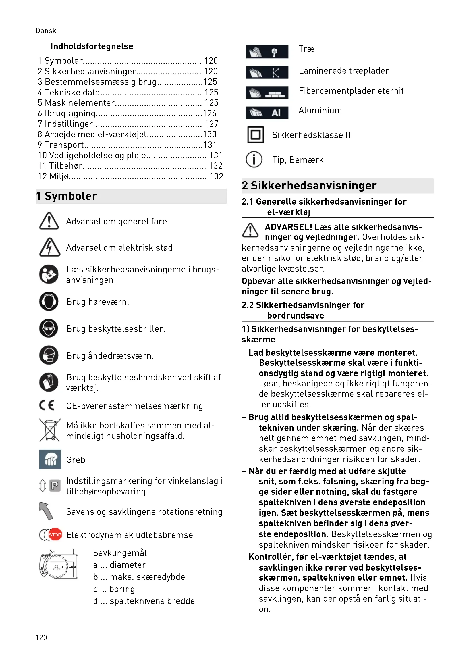 - 12 Miljø 1 Symboler Advarsel om generell fare Advarsel om elektrisk støt Les sikkerhetsanvisningene i bruker håndboken. Bruk hørselvern. Bruk vernebriller. Bruk åndedrettsvern. Bruk vernehansker når du bytter verk tøy. CE-samsvarsmerking Må ikke kastes i husholdningsavfallet. Håndtak Innstillingsmerke for vinkelanlegg i til behørsdepot Sagens og sagbladets dreieretning STOP Elektrodynamisk stoppbrems p. 144