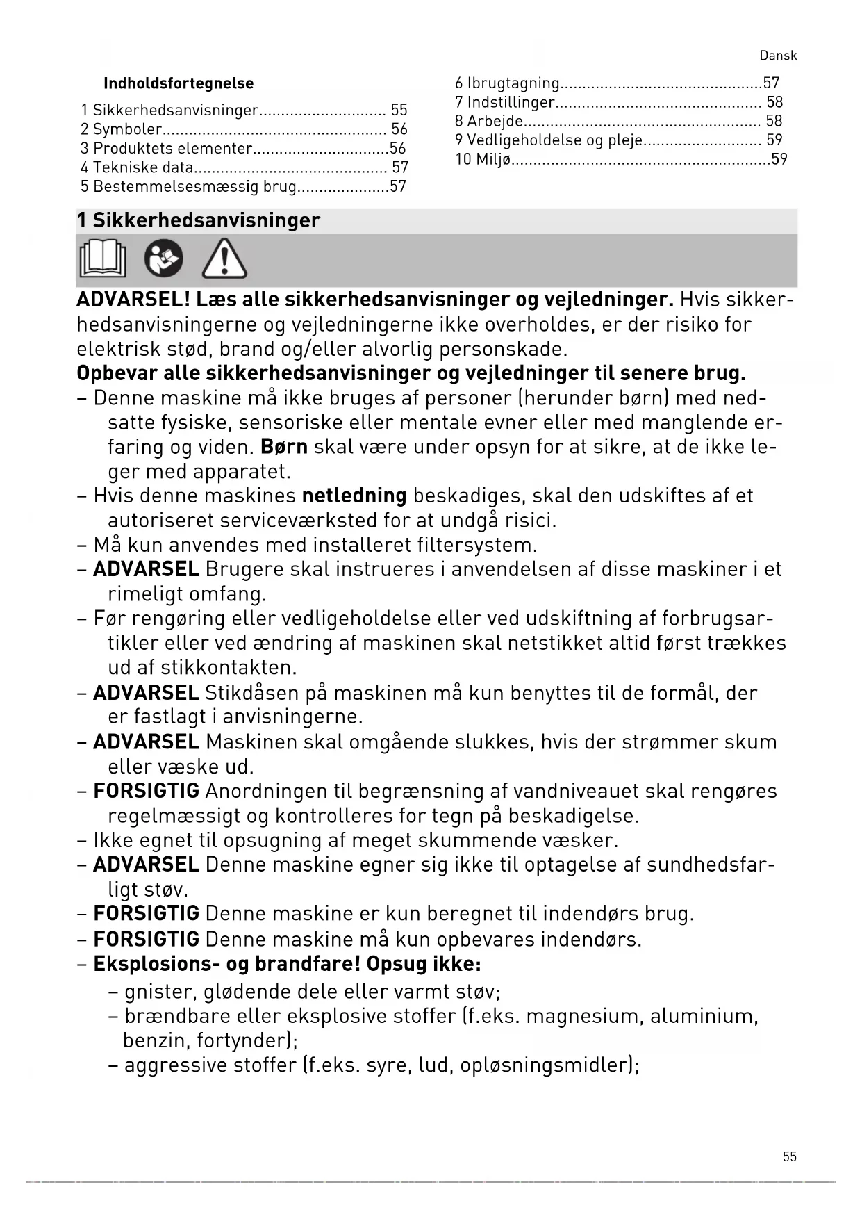 - 10 Miljø 1 Sikkerhedsanvisninger ADVARSEL! Læs alle sikkerhedsanvisninger og vejledninger. Hvis sikker hedsanvisningerne og vejledningerne ikke overholdes, er der risiko for elektrisk stød, brand og/eller alvorlig personskade. Opbevar alle sikkerhedsanvisninger og vejledninger til senere brug. – Denne maskine må ikke bruges af personer (herunder børn) med ned satte fysiske, sensoriske eller mentale evner eller med manglende er faring og viden. Børn skal være under opsyn for at sikre, at de ikke le ger med apparatet. – Hvis denne maskines netledning beskadiges, skal den udskiftes af et autoriseret serviceværksted for at undgå risici. – Må kun anvendes med installeret filtersystem. – ADVARSEL Brugere skal instrueres i anvendelsen af disse maskiner i et rimeligt omfang. – Før rengøring eller vedligeholdelse eller ved udskiftning af forbrugsar tikler eller ved ændring af maskinen skal netstikket altid først trækkes ud af stikkontakten. – ADVARSEL Stikdåsen på maskinen må kun benyttes til de formål, der er fastlagt i anvisningerne. – ADVARSEL Maskinen skal omgående slukkes, hvis der strømmer skum eller væske ud. – FORSIGTIG Anordningen til begrænsning af vandniveauet skal rengøres regelmæssigt og kontrolleres for tegn på beskadigelse. – Ikke egnet til opsugning af meget skummende væsker. – ADVARSEL Denne maskine egner sig ikke til optagelse af sundhedsfar ligt støv. – FORSIGTIG Denne maskine er kun beregnet til indendørs brug. – FORSIGTIG Denne maskine må kun opbevares indendørs. – Eksplosions- og brandfare! Opsug ikke: – gnister, glødende dele eller varmt støv; – brændbare eller eksplosive stoffer (f.eks. magnesium, aluminium, benzin, fortynder); – aggressive stoffer (f.eks. syre, lud, opløsningsmidler); Dansk 55– kemisk reaktive stoffer, som medfører dannelse af varme, syrer/ baser, gasser osv. (f.eks. reaktive tokomponent-materialer, alumini um og vand). – Nationale sikkerhedsforskrifter og oplysninger fra materialeproducen ten skal overholdes! – Må kun anvendes med egnet sikkerhedsudstyr! – Må kun anvendes i intakt stand konstateret ved visuel kontrol, i tørre omgivelser og efter oplæring! – Kontrollér regelmæssigt stikket, stikkontakten, kablet og filteret for at forebygge en risiko. Lad udelukkende et autoriseret serviceværksted udskifte beskadigede elektriske komponenter. – Må ikke løftes og transporteres med krankrog eller løfteudstyr. – Støvsugeren må ikke bæres i slangefastgørelsen [1-3]! – Stil maskinen på et jævnt underlag, og sikr den mod at rulle væk. – Dette apparat må ikke benyttes af personer, der kan reagere følsomt på et elektrisk stød (f.eks. personer med pacemaker), da statisk opladning af apparatet ikke kan udelukkes. – Brug kun den originale Festool støvsugerslange. – Tag hensyn til arbejdsomgivelserne, og pas på dig selv og andre ved transport eller arbejde med maskinen. Derved undgår du f.eks. risikoen for at snuble over støvsugerslangen eller netledningen. – Emballagefolie skal være utilgængeligt for børn. Der er risiko for kvælning. – Netstikket må kun sættes i en stikkontakt med jordforbindelse. 2 Symboler Advarsel om generel fare Advarsel om elektrisk stød Læs sikkerhedsanvisningerne i brugs anvisningen. Læs sikkerhedsanvisningerne i brugs anvisningen! Må ikke bortskaffes sammen med al mindeligt husholdningsaffald. Træk ledningen ud Brug åndedrætsværn. Opstigning forbudt CE-mærkning: Bekræfter, at el-værk tøjet er i overensstemmelse med EU- direktiverne. Tip, Bemærk Handlingsanvisning 3 Produktets elementer [1-1] Stikdåse [1-2] Lednings- og tilbehørsdepot [1-3] Slangefastgørelse [1-4] Greb [1-5] Låsemekanisme [1-6] Filterskuffe Dansk 56[1-7] Lukkeklemme [1-8] Udblæsningsåbning [1-9] Spand [1-10] Start-stop-kontakt [1-11] MAN-tast [1-12] Sugeeffektregulering De angivne illustrationer findes i tillægget til brugsanvisningen. 4 Tekniske data Støvsuger Optagen effekt 350 - 1200 W Tilslutningsværdi til maskinstikdåse maks. EU CH, DK p. 59