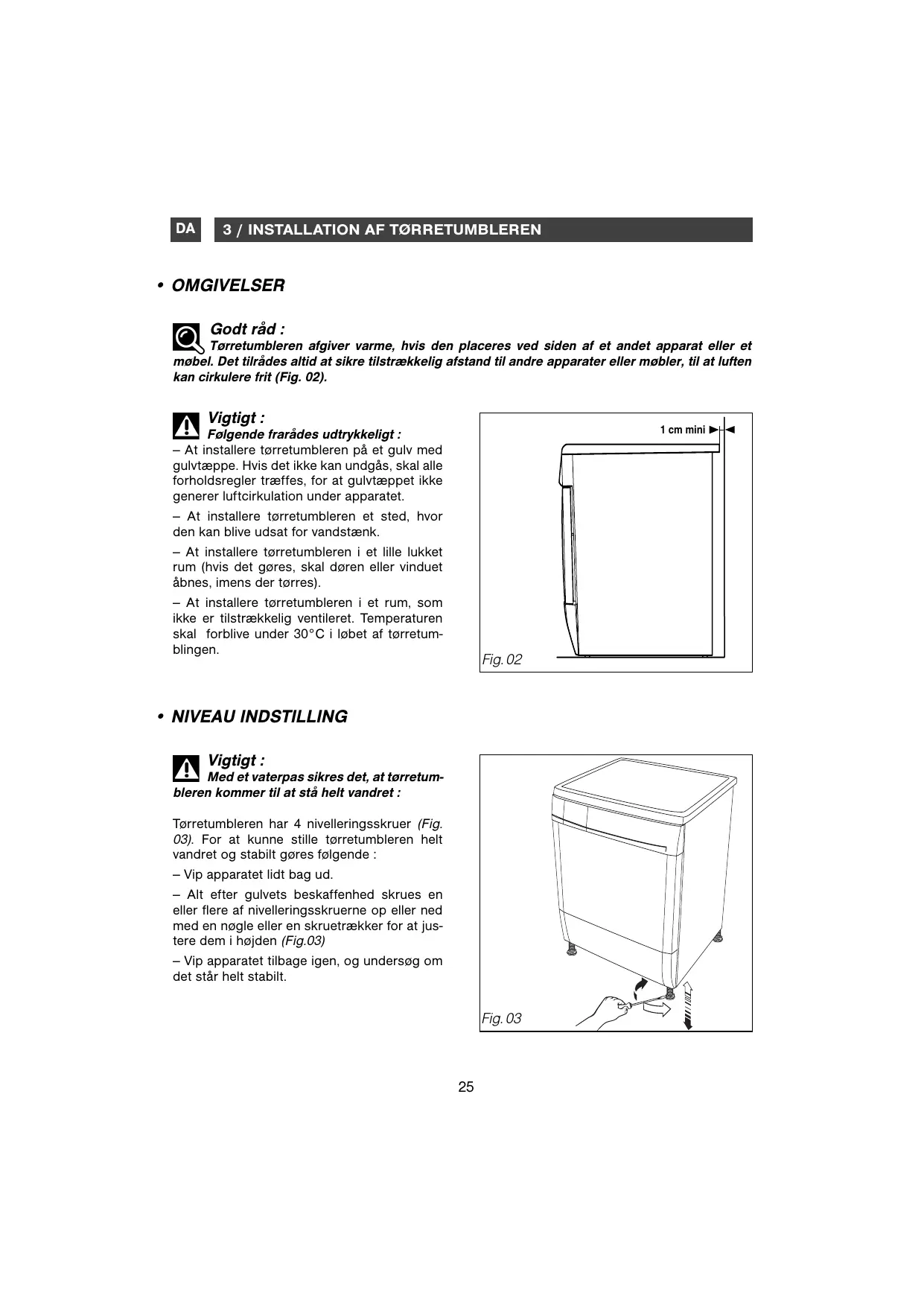 Torretumbleren afgiver varme, hvis den placeres ved sider af et andet apparat ell er et mobel. Det tilrades altid at sikre tilstrækkelig afstand til andre apparater ell mobler, til at luften kan cirkulere frit (Fig. 02).