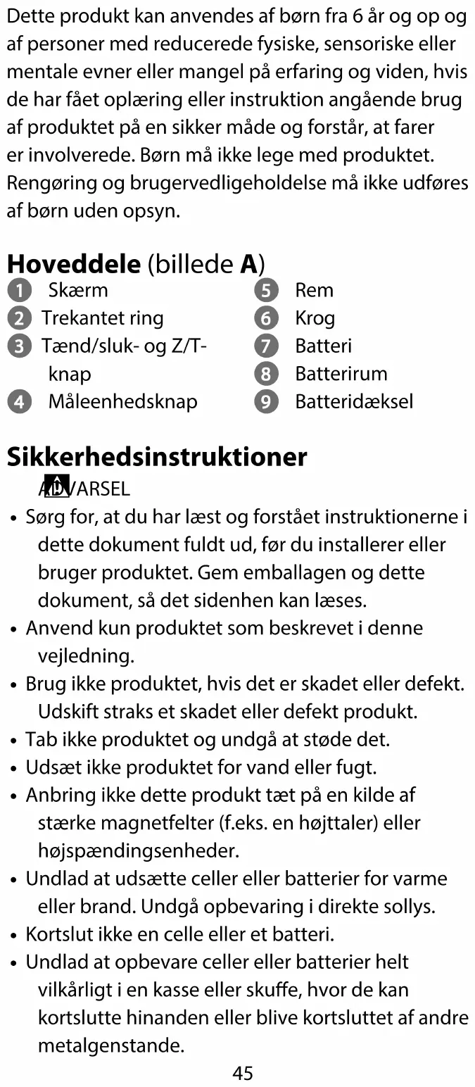Vejledning til hurtig start Digital rejsevægt til bagage SCLU112BUYderligere oplysninger ndes i den udvidede manual online: ned.is/sclu112bu Tilsigtet brug SCLU112BU er en meget præcis digital bærbar vægt.Dette produkt er beregnet til at veje bagage på en nem og hurtig måde.Produktet er kun beregnet til indendørs brug.Enhver modicering af produktet kan have konsekvenser for sikkerhed, garanti og korrekt funktion.45 Dette produkt kan anvendes af børn fra 6 år og op og af personer med reducerede fysiske, sensoriske eller mentale evner eller mangel på erfaring og viden, hvis de har fået oplæring eller instruktion angående brug af produktet på en sikker måde og forstår, at farer er involverede. Børn må ikke lege med produktet. Rengøring og brugervedligeholdelse må ikke udføres af børn uden opsyn. Hoveddele (billede A) 1 Skærm 2 Trekantet ring 3 Tænd/sluk- og Z/T- knap 4 Måleenhedsknap 5 Rem 6 Krog 7 Batteri 8 Batterirum 9 Batteridæksel Sikkerhedsinstruktioner