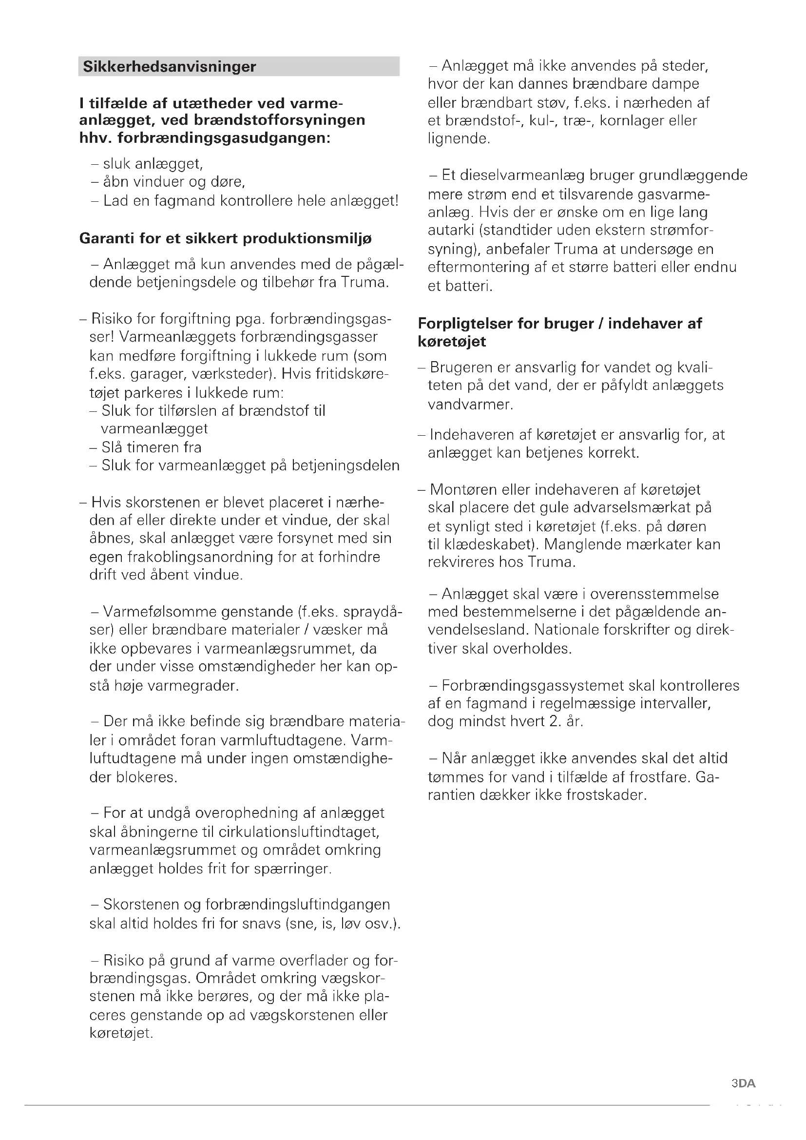Fig. 13DA – Anlægget må ikke anvendes på steder, hvor der kan dannes brændbare dampe eller brændbart støv, f.eks. i nærheden af et brændstof-, kul-, træ-, kornlager eller lignende. – Et dieselvarmeanlæg bruger grundlæggende mere strøm end et tilsvarende gasvarme- anlæg. Hvis der er ønske om en lige lang autarki (standtider uden ekstern strømfor- syning), anbefaler Truma at undersøge en eftermontering af et større batteri eller endnu et batteri. Forpligtelser for bruger / indehaver af køretøjet – Brugeren er ansvarlig for vandet og kvali- teten på det vand, der er påfyldt anlæggets vandvarmer. – Indehaveren af køretøjet er ansvarlig for, at anlægget kan betjenes korrekt. – Montøren eller indehaveren af køretøjet skal placere det gule advarselsmærkat på et synligt sted i køretøjet (f.eks. på døren til klædeskabet). Manglende mærkater kan rekvireres hos Truma. – Anlægget skal være i overensstemmelse med bestemmelserne i det pågældende an- vendelsesland. Nationale forskrifter og direk- tiver skal overholdes. – Forbrændingsgassystemet skal kontrolleres af en fagmand i regelmæssige intervaller, dog mindst hvert 2. år. – Når anlægget ikke anvendes skal det altid tømmes for vand i tilfælde af frostfare. Ga- rantien dækker ikke frostskader. Sikkerhedsanvisninger I tilfælde af utætheder ved varme‑ anlægget, ved brændstofforsyningen hhv. forbrændingsgasudgangen: – sluk anlægget, – åbn vinduer og døre, – Lad en fagmand kontrollere hele anlægget! Garanti for et sikkert produktionsmiljø – Anlægget må kun anvendes med de pågæl- dende betjeningsdele og tilbehør fra Truma. – Risiko for forgiftning pga. forbrændingsgas- ser! Varmeanlæggets forbrændingsgasser kan medføre forgiftning i lukkede rum (som f.eks. garager, værksteder). Hvis fritidskøre- tøjet parkeres i lukkede rum: – Sluk for tilførslen af brændstof til varmeanlægget – Slå timeren fra – Sluk for varmeanlægget på betjeningsdelen – Hvis skorstenen er blevet placeret i nærhe- den af eller direkte under et vindue, der skal åbnes, skal anlægget være forsynet med sin egen frakoblingsanordning for at forhindre drift ved åbent vindue. – Varmefølsomme genstande (f.eks. spraydå- ser) eller brændbare materialer / væsker må ikke opbevares i varmeanlægsrummet, da der under visse omstændigheder her kan op- stå høje varmegrader. – Der må ikke befinde sig brændbare materia- ler i området foran varmluftudtagene. Varm- luftudtagene må under ingen omstændighe- der blokeres. – For at undgå overophedning af anlægget skal åbningerne til cirkulationsluftindtaget, varmeanlægsrummet og området omkring anlægget holdes frit for spærringer. – Skorstenen og forbrændingsluftindgangen skal altid holdes fri for snavs (sne, is, løv osv.). – Risiko på grund af varme overflader og for- brændingsgas. Området omkring vægskor- stenen må ikke berøres, og der må ikke pla- ceres genstande op ad vægskorstenen eller køretøjet.4 DA Sikker drift – Ved varmedrift må tanken ikke køres tom helt ned til tankvisningens reservemærke. I tilfælde af at køretøjstanken er kørt helt tom, så sidder indtagsledningens åbning til brændstof ca. på højde med brændstofover- fladen. I denne tilstand suges der større luftmængder ind, specielt hvis brændstoffet under kørslen skvulper i køretøjstanken. Det- te medfører en uregelmæssig brændstof- forsyning af anlægget. Anlæggets brænder kan i denne tilstand ikke opretholde en ren forbrænding (os- og lugtdannelse). – Kontrollér, at ventilationen i køretøjet er til- strækkelig. Ved idrifttagning af anlægget kan der kortvarigt opstå røg og lugt. Dette skyl- des støv og snavs. Det er særligt tilfældet, hvis anlægget ikke har været i brug gennem længere tid. – Anlægget kan anvendes af børn fra 8 år samt af personer med nedsatte fysiske, sensoriske eller mentale evner eller manglende erfaring og viden, hvis de er under opsyn eller er ble- vet instrueret i sikker brug af anlægget, og forstår de dermed forbundne farer. Børn må ikke lege med anlægget. – Forbrændingsgasdobbeltrøret (forbrændings- gaslyddæmper- og udsugningsrør) skal re- gelmæssigt kontrolleres for beskadigelse og fast tilslutning – dette gælder især efter læn- gere køreture. Derudover skal det kontrolle- res, at anlægget og skorstenen er fastgjort korrekt. Anvendelse under kørsel – Anlægget må ikke anvendes under tankning, i parkeringshuse, garager eller på færger. – Undlad at sprøjte direkte i vægskorstenen under rengøring for at undgå risiko for be- skadigelse af anlægget fra vandsprøjt. Forholdsregler ved fejl – Sluk for Combi i tilfælde af usædvanlige lyde eller lugte. – Det medfører risiko for brand / eksplosion, hvis Combi forsøges anvendt, mens anlæg- get har vandskader, eller hvis køretøjet har været involveret i et uheld. En beskadiget Combi skal repareres af en fagmand eller skiftes ud. – Reparationer på anlægget må kun udføres af en fagmand. – Defekter skal straks repareres af en fagmand. – Man må kun selv rette fejl, hvis fejlretningen er beskrevet i fejlfindingsvejledningen i den- ne brugsanvisning. – Efter en hurtig forbrænding (fejltænding) kontrolleres anlægget og forbrændingsgas- udgangen af en fagmand. Vedligeholdelse / reparation / rengøring – Reparationer og rengøring af anlægget må kun foretages af en fagmand. – Garantien bortfalder, og producenten fralæg- ger sig ethvert ansvar: – ved ændringer på anlægget (inklusive tilbehør), – ved ændring af forbrændingsgasudgang og skorsten, – hvis der ikke anvendes originale Truma-dele som reservedele og tilbehør, – hvis monterings- og brugsanvisningen ikke følges. Desuden bortfalder brugsretten til anlægget og dermed også i mange lande førertilladel- sen til køretøjet. – Nye anlæg og anlæg, der ikke har været brugt i længere tid, skal – sa