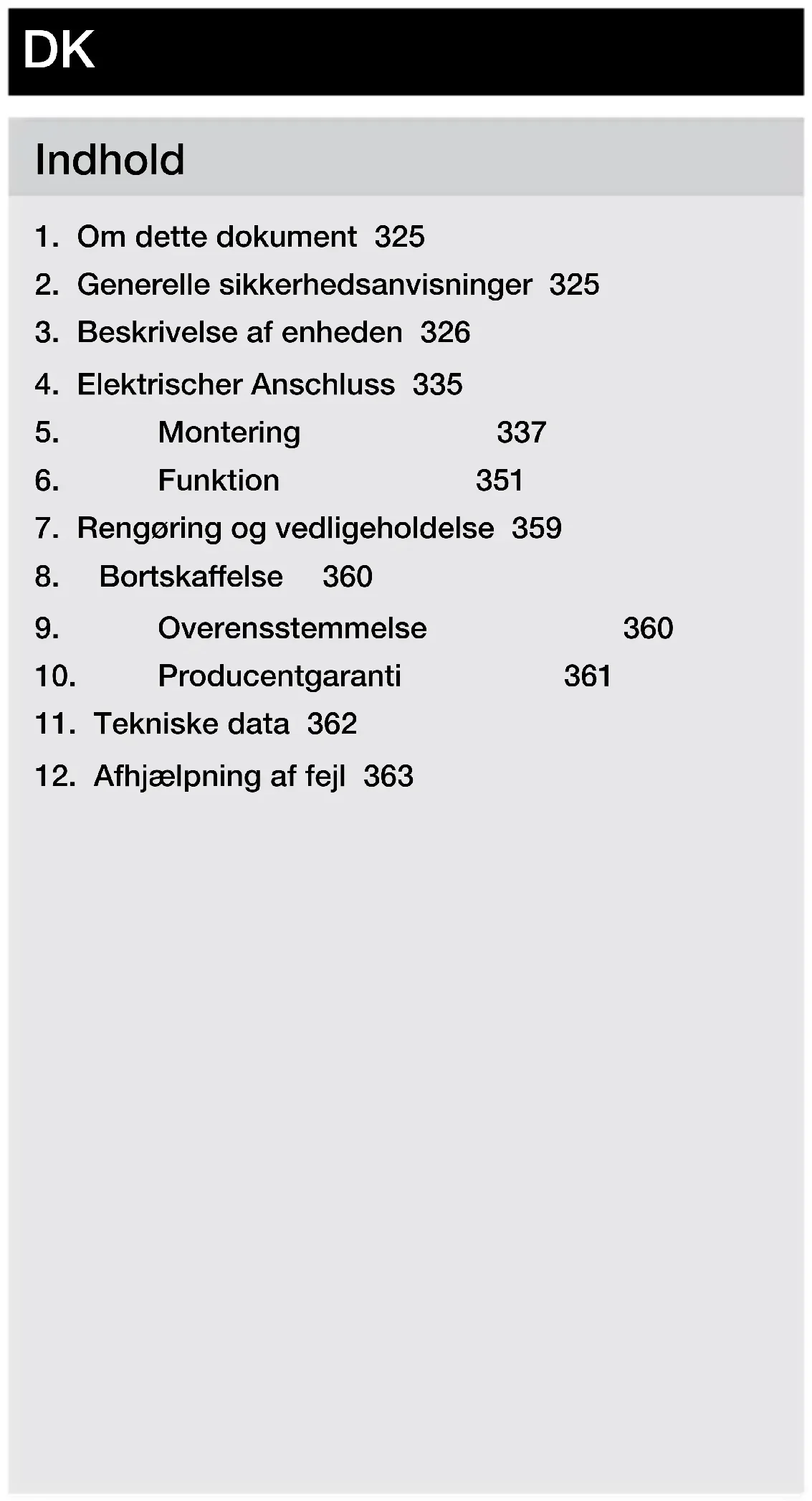 - Opbevar brugsanvisningen, så der er adgang til den. – Håndtering af elektrisk strøm kan medføre farlige situa- tioner. Berøring af strøm førende dele kan give elektrisk stød, forbrændinger og medføre dødsfald. – Arbejde på netspænding må kun udføres af kvaliceret fagpersonale. – Overhold det pågældende lands installationsforskrifter og tilslutningsregler (f.eks. DE: VDE0100, AT:ÖVE- ÖNORM E8001-1, CH:SEV1000). – Brug kun originale reservedele. – Reparationer må kun udføres af specialvirksomheder.– 326 – Indhold