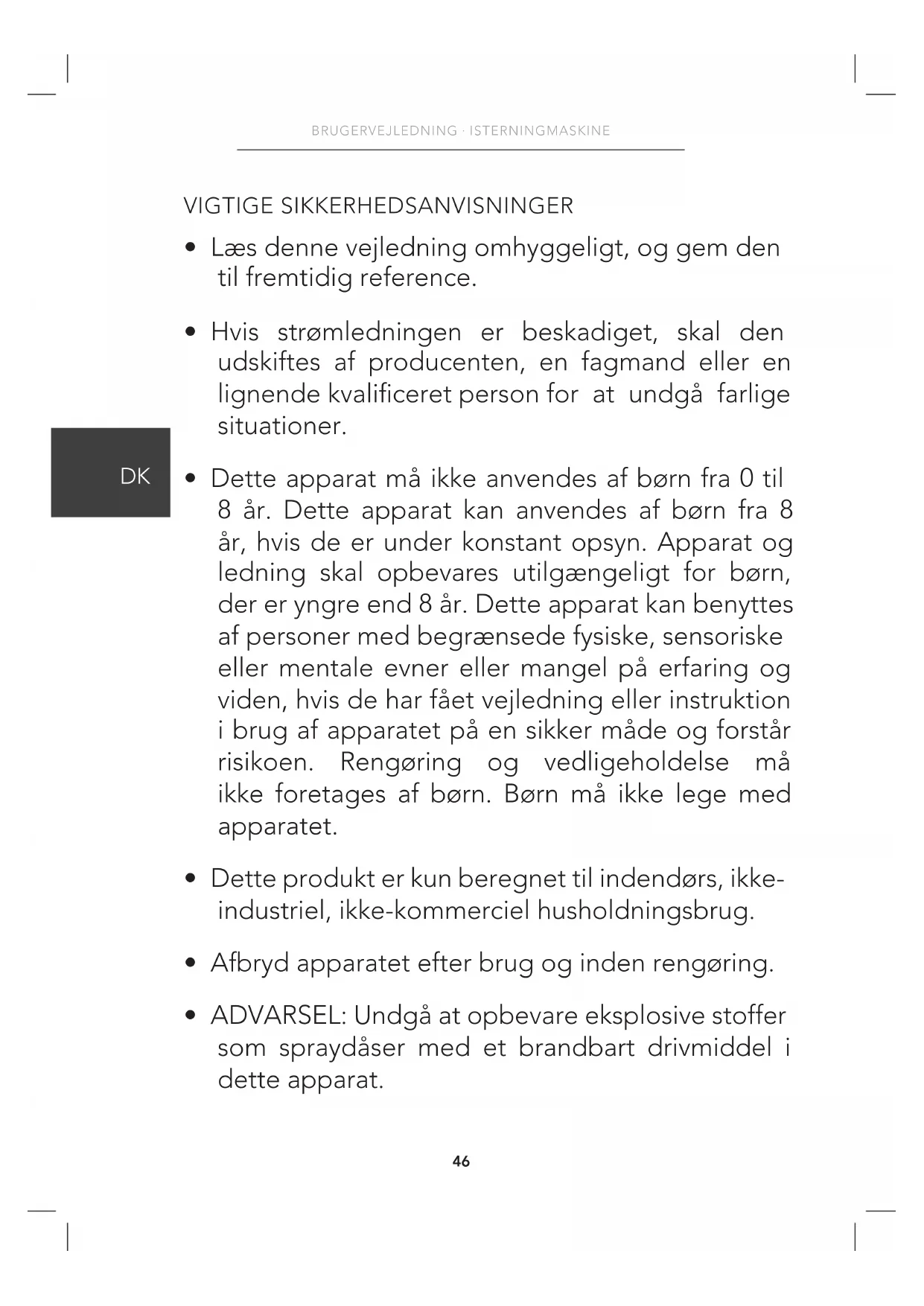 - Dette apparat må ikke anvendes af børn fra 0 til 8 år. Dette apparat kan anvendes af børn fra 8 år, hvis de er under konstant opsyn. Apparat og ledning skal opbevares utilgængeligt for børn, der er yngre end 8 år. Dette apparat kan benyttes af personer med begrænsede fysiske, sensoriske eller mentale evner eller mangel på erfaring og viden, hvis de har fået vejledning eller instruktion i brug af apparatet på en sikker måde og forstår risikoen. Rengøring og vedligeholdelse må ikke foretages af børn. Børn må ikke lege med apparatet.