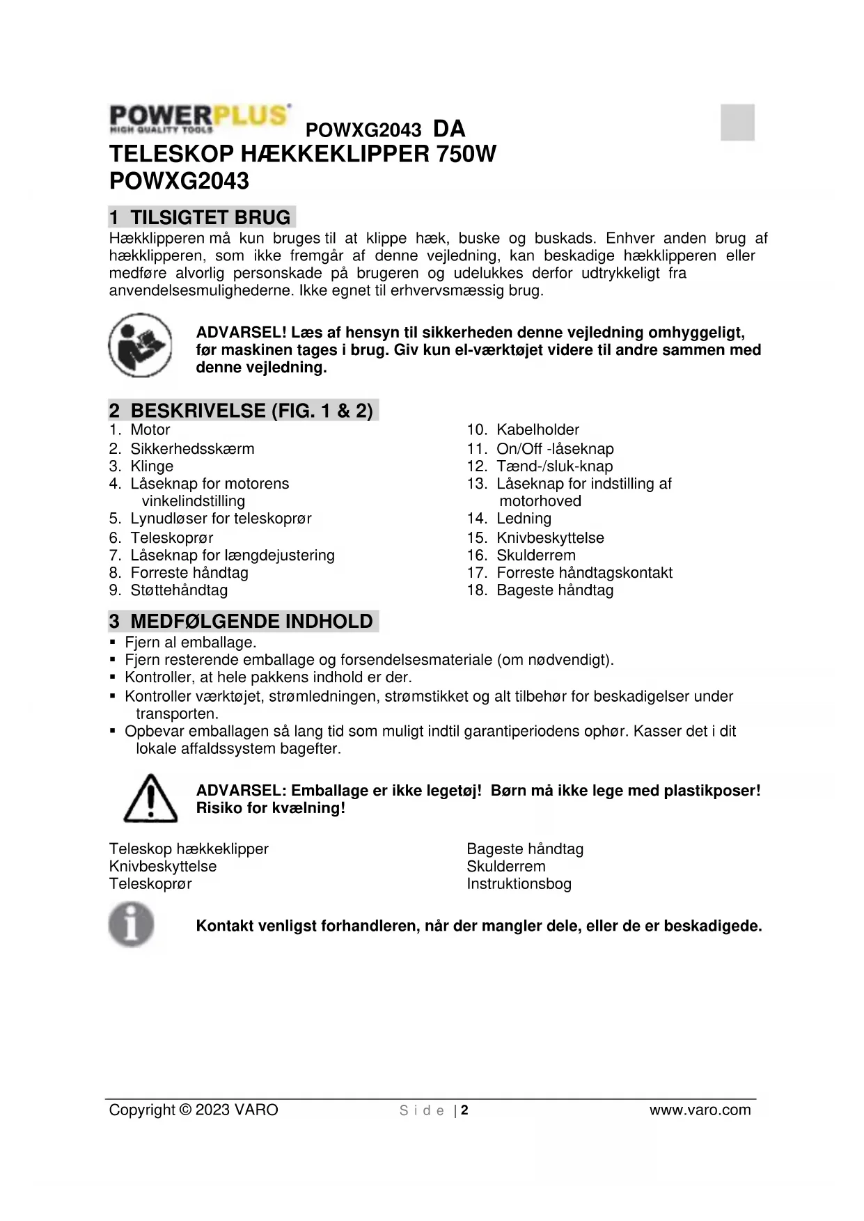 - Opbevar emballagen så lang tid som muligt indtil garantiperiodens ophør. Kasser det i dit lokale affaldssystem bagefter. ADVARSEL: Emballage er ikke legetøj! Børn må ikke lege med plastikposer! Risiko for kvælning! Teleskop hækkeklipper Knivbeskyttelse Teleskoprør Bageste håndtag Skulderrem Instruktionsbog Kontakt venligst forhandleren, når der mangler dele, eller de er beskadigede.POWXG2043 DA Copyright © 2023 VARO S i d e | 3 www.varo.com 4 SYMBOLER I denne brugervejledning og/eller på maskinen anvendes der følgende piktogrammer: