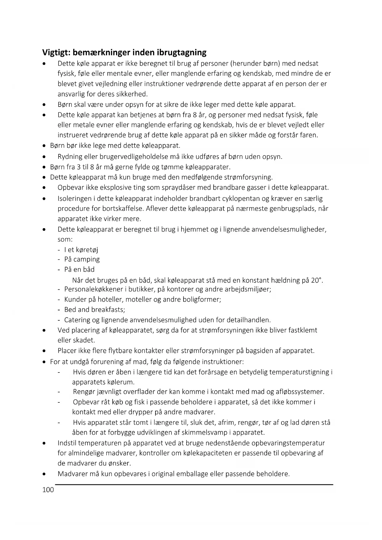 - Dette køleapparat er beregnet til brug i hjemmet og i lignende anvendelsesmuligheder, som: - I et køretøj - På camping - På en båd Når det bruges på en båd, skal køleapparat stå med en konstant hældning på 20°. - Personalekøkkener i butikker, på kontorer og andre arbejdsmiljøer; - Kunder på hoteller, moteller og andre boligformer; - Bed and breakfasts; - Catering og lignende anvendelsesmulighed uden for detailhandlen.