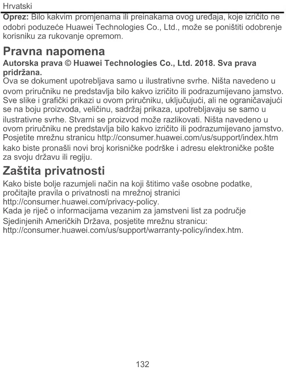 udtrykkeligt er godkendt af Huawei Technologies Co., Ltd., kan ugyldiggøre brugerens godkendelse til at betjene udstyret. Juridisk erklæring Copyright © Huawei Technologies Co., Ltd. 2018. Alle rettigheder forbeholdes. Dette dokument er kun vejledende. Ingen del i denne vejledning udgør en garanti af nogen art, hverken direkte eller indirekte. Alle billeder og illustrationer i denne vejledning, herunder, men ikke begrænset til, produktets farve, størrelse, og skærmindhold, tjener udelukkende som reference. Det faktiske produkt kan variere. Ingen del i denne vejledning udgør en garanti af nogen art, hverken direkte eller indirekte. Se den opdaterede oversigt over hotline og e-mailadresser for dit land eller område på http://consumer.huawei.com/us/support/index.htm. Beskyttelse af personlige oplysninger For at forstå, hvordan vi beskytter dine personoplysninger, bedes du besøge http://consumer.huawei.com/privacy-policy og læse vores politik for beskyttelse af personlige oplysninger. Du kan finde oplysninger om garantibevis i USA ved at besøge http://consumer.huawei.com/us/support/warranty-policy/index.htm.Estonian