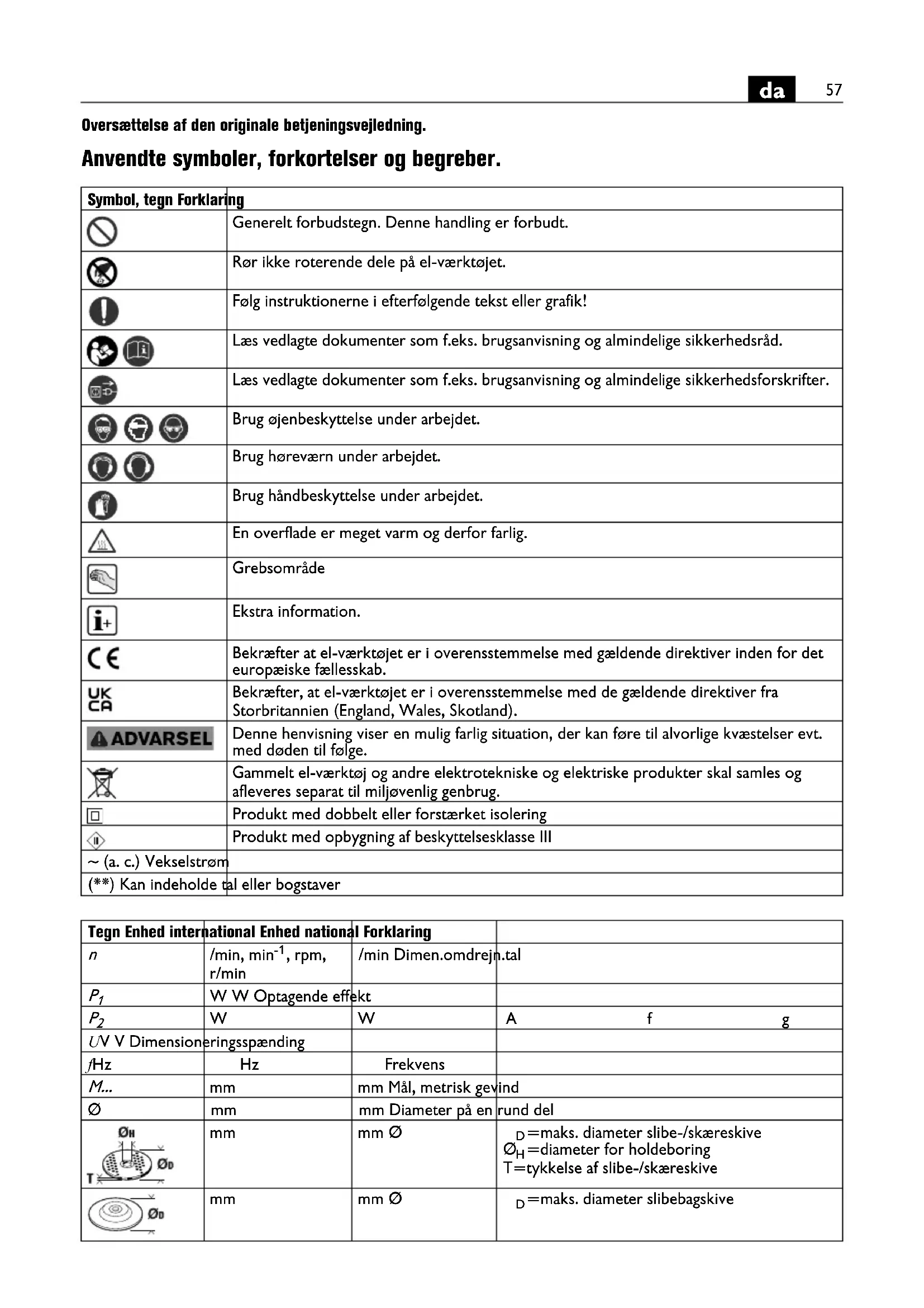 Oversættelse af den originale betjeningsvejledning. Anvendte symboler, forkortelser og begreber. Symbol, tegn Forklaring Generelt forbudstegn. Denne handling er forbudt. Rør ikke roterende dele på el-værktøjet. Følg instruktionerne i efterfølgende tekst eller grafik! Læs vedlagte dokumenter som f.eks. brugsanvisning og almindelige sikkerhedsråd. Læs vedlagte dokumenter som f.eks. brugsanvisning og almindelige sikkerhedsforskrifter. Brug øjenbeskyttelse under arbejdet. Brug høreværn under arbejdet. Brug håndbeskyttelse under arbejdet. En overflade er meget varm og derfor farlig. Grebsområde Ekstra information. Bekræfter at el-værktøjet er i overensstemmelse med gældende direktiver inden for det europæiske fællesskab. Bekræfter, at el-værktøjet er i overensstemmelse med de gældende direktiver fra Storbritannien (England, Wales, Skotland). Denne henvisning viser en mulig farlig situation, der kan føre til alvorlige kvæstelser evt. med døden til følge. Gammelt el-værktøj og andre elektrotekniske og elektriske produkter skal samles og afleveres separat til miljøvenlig genbrug. Produkt med dobbelt eller forstærket isolering Produkt med opbygning af beskyttelsesklasse III ~ (a. c.) Vekselstrøm (**) Kan indeholde tal eller bogstaver Tegn Enhed international Enhed national Forklaring
