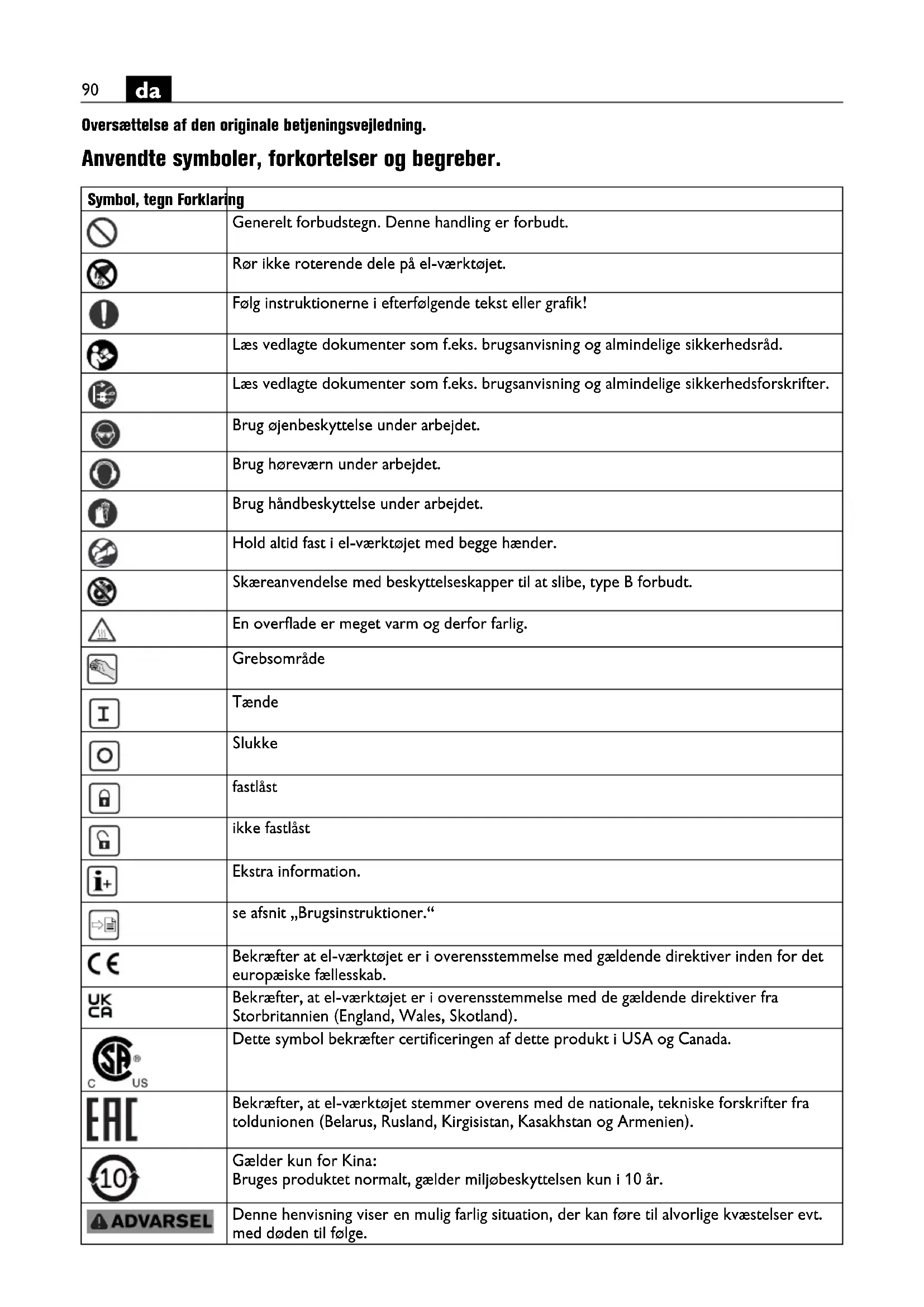 Oversættelse af den originale betjeningsvejledning. Anvendte symboler, forkortelser og begreber. Symbol, tegn Forklaring Generelt forbudstegn. Denne handling er forbudt. Rør ikke roterende dele på el-værktøjet. Følg instruktionerne i efterfølgende tekst eller grafik! Læs vedlagte dokumenter som f.eks. brugsanvisning og almindelige sikkerhedsråd. Læs vedlagte dokumenter som f.eks. brugsanvisning og almindelige sikkerhedsforskrifter. Brug øjenbeskyttelse under arbejdet. Brug høreværn under arbejdet. Brug håndbeskyttelse under arbejdet. Hold altid fast i el-værktøjet med begge hænder. Skæreanvendelse med beskyttelseskapper til at slibe, type B forbudt. En overflade er meget varm og derfor farlig. Grebsområde Tænde Slukke fastlåst ikke fastlåst Ekstra information. se afsnit „Brugsinstruktioner.“ Bekræfter at el-værktøjet er i overensstemmelse med gældende direktiver inden for det europæiske fællesskab. Bekræfter, at el-værktøjet er i overensstemmelse med de gældende direktiver fra Storbritannien (England, Wales, Skotland). Dette symbol bekræfter certificeringen af dette produkt i USA og Canada. Bekræfter, at el-værktøjet stemmer overens med de nationale, tekniske forskrifter fra toldunionen (Belarus, Rusland, Kirgisistan, Kasakhstan og Armenien). Gælder kun for Kina: Bruges produktet normalt, gælder miljøbeskyttelsen kun i 10 år. Denne henvisning viser en mulig farlig situation, der kan føre til alvorlige kvæstelser evt. med døden til følge.91