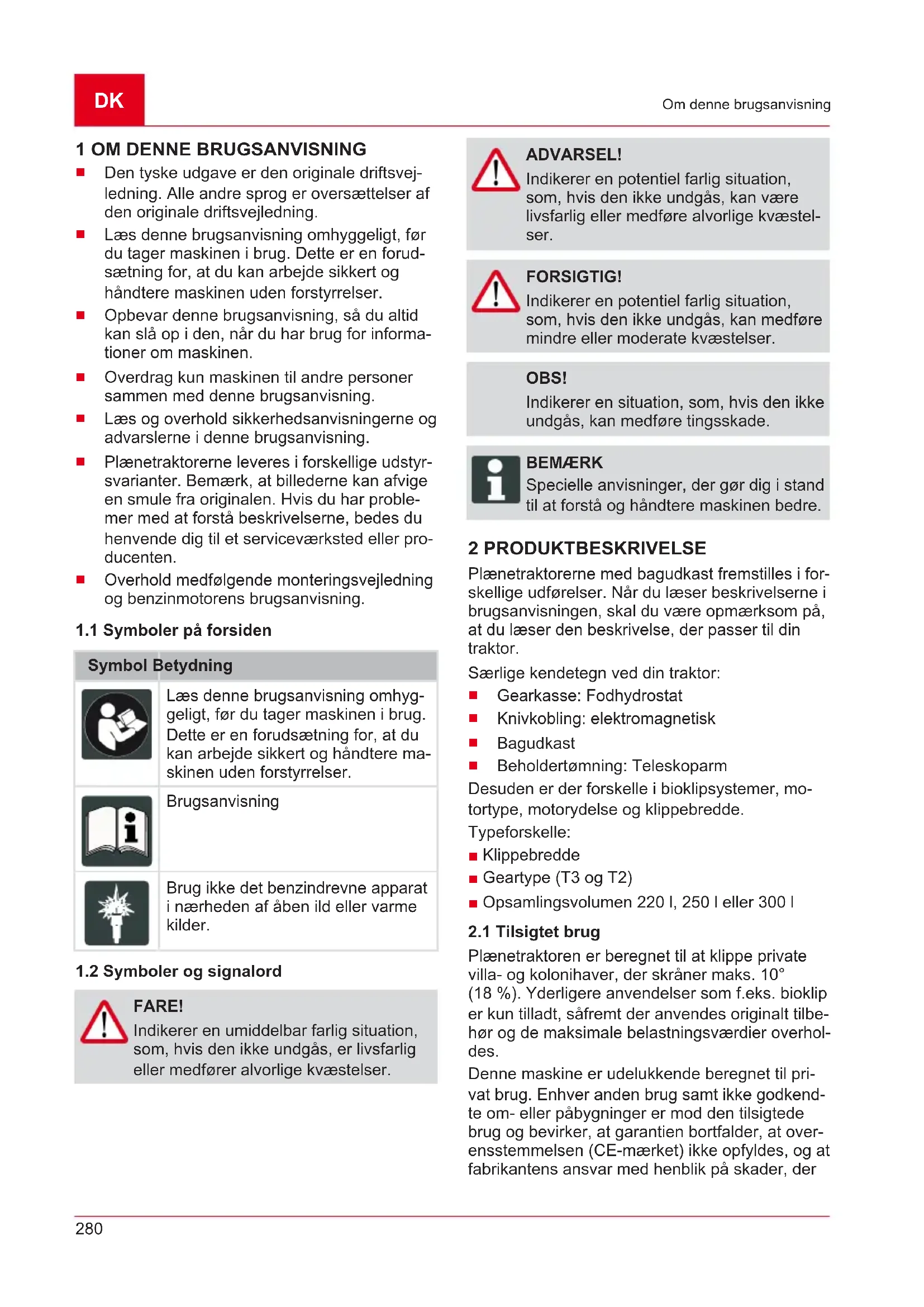 FARE! Indikerer en umiddelbar farlig situation, som, hvis den ikke undgås, er livsfarlig eller medfører alvorlige kvæstelser. ADVARSEL! Indikerer en potentiel farlig situation, som, hvis den ikke undgås, kan være livsfarlig eller medføre alvorlige kvæstel- ser. FORSIGTIG! Indikerer en potentiel farlig situation, som, hvis den ikke undgås, kan medføre mindre eller moderate kvæstelser. OBS! Indikerer en situation, som, hvis den ikke undgås, kan medføre tingsskade. BEMÆRK Specielle anvisninger, der gør dig i stand til at forstå og håndtere maskinen bedre. 2 PRODUKTBESKRIVELSE Plænetraktorerne med bagudkast fremstilles i for- skellige udførelser. Når du læser beskrivelserne i brugsanvisningen, skal du være opmærksom på, at du læser den beskrivelse, der passer til din traktor. Særlige kendetegn ved din traktor: