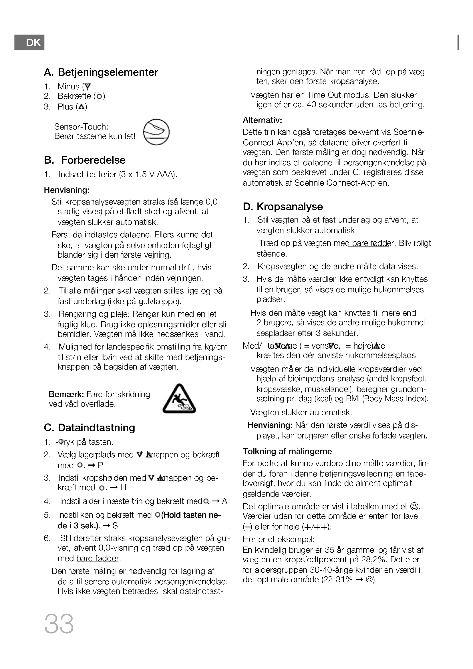 Stil derefter straks kropsanalysevægten på gul- vet, afvent 0,0-visning og træd op på vægten med bare fødder. Den første måling er nødvendig for lagring af data til senere automatisk persongenkendelse. Hvis ikke vægten betrædes, skal dataindtast- ningen gentages. Når man har trådt op på væg- ten, sker den første kropsanalyse. Vægten har en Time Out modus. Den slukker igen efter ca. 40 sekunder uden tastbetjening. Alternativ: Dette trin kan også foretages bekvemt via Soehnle- Connect-App’en, så dataene bliver overført til vægten. Den første måling er dog nødvendig. Når du har indtastet dataene til persongenkendelse på vægten som beskrevet under C, registreres disse automatisk af Soehnle Connect-App’en. D. Kropsanalyse