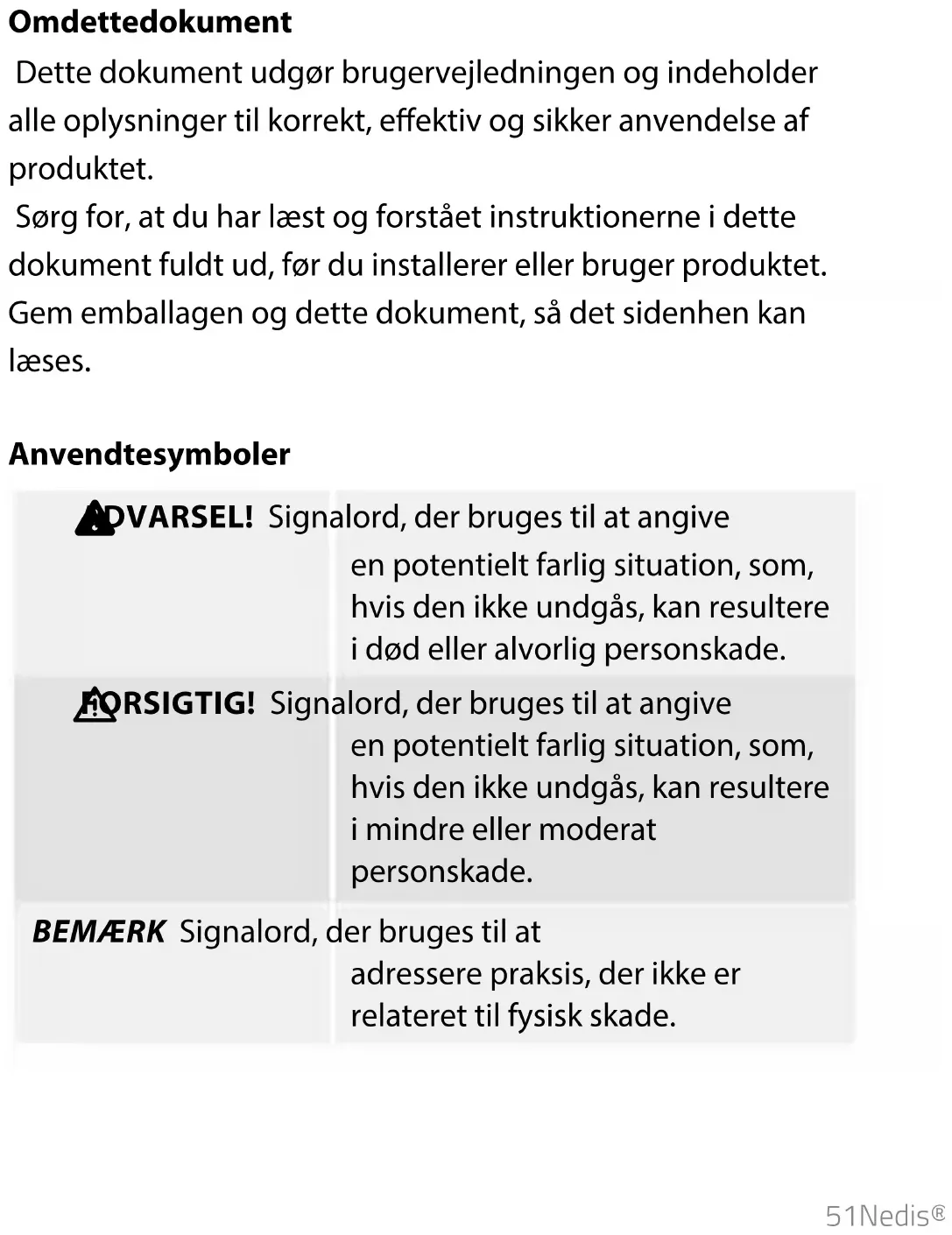 FORSIGTIG! Signalord, der bruges til at angive en potentielt farlig situation, som, hvis den ikke undgås, kan resultere i mindre eller moderat personskade. BEMÆRK Signalord, der bruges til at adressere praksis, der ikke er relateret til fysisk skade.52 Tilsigtet brug Dette produkt er beregnet som et kamera til at se, høre og tale til besøgende. Dette produkt er beregnet til at blive brugt med Nedis SmartLife-app. Anvend kun produktet som beskrevet i denne brugervejledning. Enhver modicering af produktet kan have konsekvenser for sikkerhed, garanti og korrekt funktion. Sikkerhedsinstruktioner Sørg for, at du har læst og forstået instruktionerne i dette dokument fuldt ud, før du installerer eller bruger produktet. Gem emballagen og dette dokument, så det sidenhen kan læses.