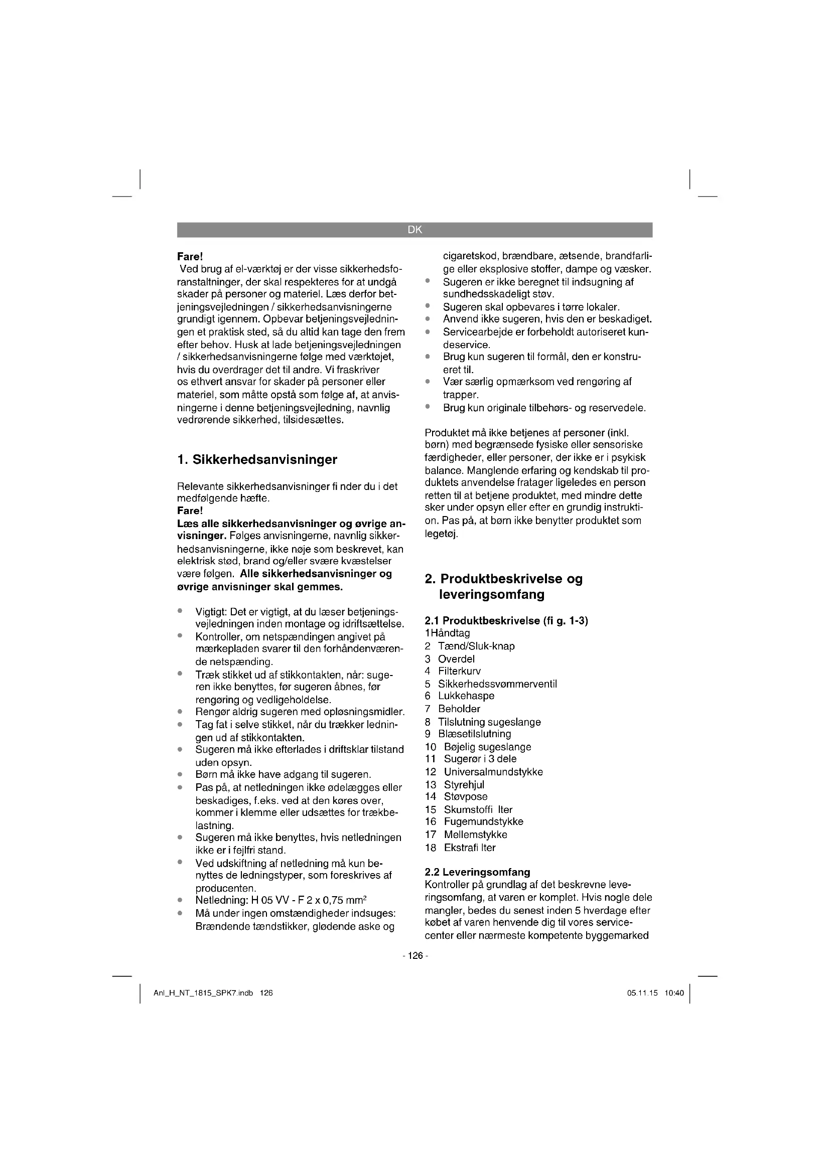 Kontroller med jævne mellemrum og hver gang, inden du tager våd-/tørsugeren i brug, at fi ltrene sidder ordentligt fast. Anl_H_NT_1815_SPK7.indb 128Anl_H_NT_1815_SPK7.indb 128 05.11.15 10:4005.11.15 10:40DK