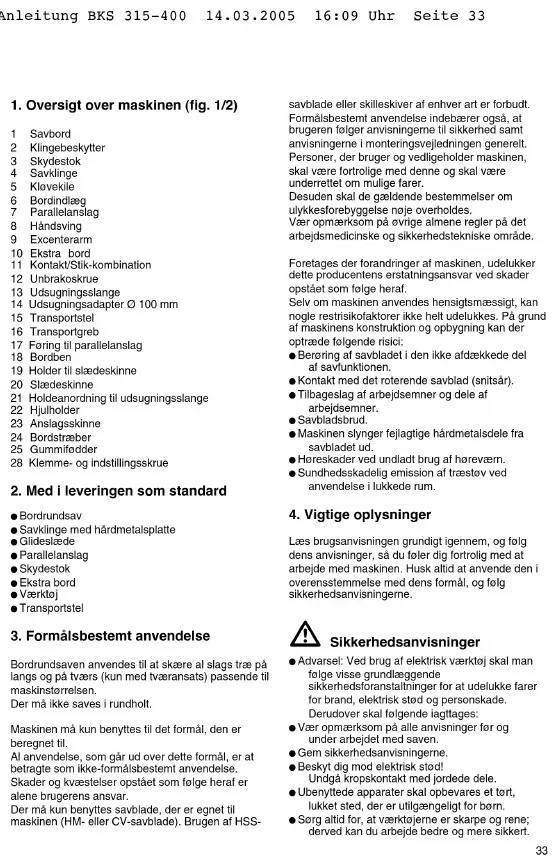 Anleitung BKS 315-400 14.03.2005 16:09 Uhr Seite 3435 Sluk maskinen, inden du udbedrer fejl eller fjerner træstykker, der er kommet i klemme. - Træk stikket ud. - Ved udslag af savsnittet skal bordindlægget (6) fornyes. -Træk stikket ud.- Omstillinger samt indstillings-, måle og rensningsarbejde må kun udføres, når motoren er slukket. - Træk stikket ud. - Kontroller, om nøgler og indstillingsværktøj er fjernet, før maskinen tændes. Når arbejdsområdet forlades, skal motoren slukkes og stikket trækkes ud. Alle beskyttelses- og sikkerhedsanordninger skal omgående monteres igen efter afsluttet reparation eller vedligeholdelse. Producentens oplysninger om sikkerhed, arbejde og vedligeholdelse samt de målinger, der er nævnt i de tekniske data, skal overholdes. Vær opmærksom på gældende bestemmelser med hensyn til ulykkesforebyggelse og øvrige, almindeligt anerkendte sikkerhedstekniske regler. Bemærk evt. oplysningshæfter fra brancheforening. Hver gang maskinen tages i brug, skal støvsugningsanordningen tilsluttes. Brug kun saven med et egnet udsugningsanlæg eller en gængs industristøvsuger; derved undgås skader fra savaffald. Bordrundsaven skal tilsluttes til en 400 V sikkerhedsstikdåse, med en mindstesikring på 10 A. Brug ikke maskiner med nedsat funktionsevne til store opgaver. Brug ikke ledningen til uhensigtsmæssige formål! Sørg for, at du står sikkert og altid i ligevægt. Kontroller, om værktøjet muligvis er beskadiget! Før værktøjet tages i brug igen, skal beskyttelsesanordninger eller lettere beskadigede dele kontrolleres omhyggeligt, så de fungerer hensigtsmæssigt og uden problemer. Kontroller, om de bevægelige dele fungerer uden problemer og ikke sidder fast, eller om der er beskadigede dele. Alle dele skal være rigtigt monteret og overholde alle betingelser, så du er sikker på, at værktøjet fungerer upåklageligt. Beskadigede beskyttelsesanordninger og dele skal repareres eller udskiftes på et autoriseret værksted, med mindre andet er anført i brugsanvisningen. Beskadigede kontakter udskiftes på et serviceværksted. Dette værktøj er i overensstemmelse med de pågældende sikkerhedsbestemmelser. Reparationer, som berører originale reservedele, må kun udføres af el-fagmand; ellers udsættes brugeren for en skadesrisiko. Bemærk omdrejningsretning for motor og savklinge. Brug kun savklinger med en maksimal tilladt hastighed, som ikke ligger under den maksimale spindelhastighed for bordrundsav og arbejdsemne. Brug kun savklinger, som anbefales af producenten, og som imødekommer kravene i EN 847-1-standarden. Ved skift af savklinge må a) snitbredden ikke være mindre end tykkelsen på kløvekilen; b) tykkelsen på klingens savskive ikke være større end tykkelsen på kløvekilen – sæt et skilt op med denne oplysning. Den bevægelige beskyttelseskappe (2) må ikke klemmes fast i åben tilstand. Brug den øverste klingebeskyttelsesanordning, og indstil korrekt. Nedslidte bordindsatser skal skiftes ud. Ved længdeskæring af smalle arbejdsemner er brug af skydestok (3) påbudt (bredde mindre end 120 mm). Skydestok eller håndtag til skydetræ skal opbevares ved maskinen, når de ikke er i brug. Støvudsugningen skal sluttes til, hver gang du arbejder. Ved savning af træ skal rundsave sluttes til en støvopfangende anordning. Operatøren skal være informeret om de betingelser, som har indflydelse på støvdannelsen, f.eks. typen af det materiale, der skal bearbejdes (registrering og kilde), betydning af lokal udskillelse og den rigtige indstilling af kapper/ledeplader/føringer. Om nødvendigt benyttes passende personligt beskyttelsesudstyr. Det kan f.eks. være: - Høreværn for at modvirke risikoen for nedsat høreevne; - Åndedrætsværn for at modvirke risikoen for indånding af sundhedsfarligt støv. -Handsker til håndtering af savklinger og ru materialer. Beholder til praktisk opbevaring af savklinger. Operatøren skal være informeret om de betingelser, som har indflydelse på støjudviklingen (f.eks. savklinger, som er konstrueret til støjreducerende drift, pleje af savklinge og maskine). Fejl i maskinen, inklusiv beskyttelsesudstyr og savklinge, skal meddeles den sikkerhedsansvarlige med det samme. Ved transport af maskinen skal transportudstyret benyttes – beskyttelsesudstyr må ikke anvendes til håndtering eller transport af maskinen. Under transporten bør den øverste del af savklingen være dækket af, f.eks. af beskyttelsesanordningen.