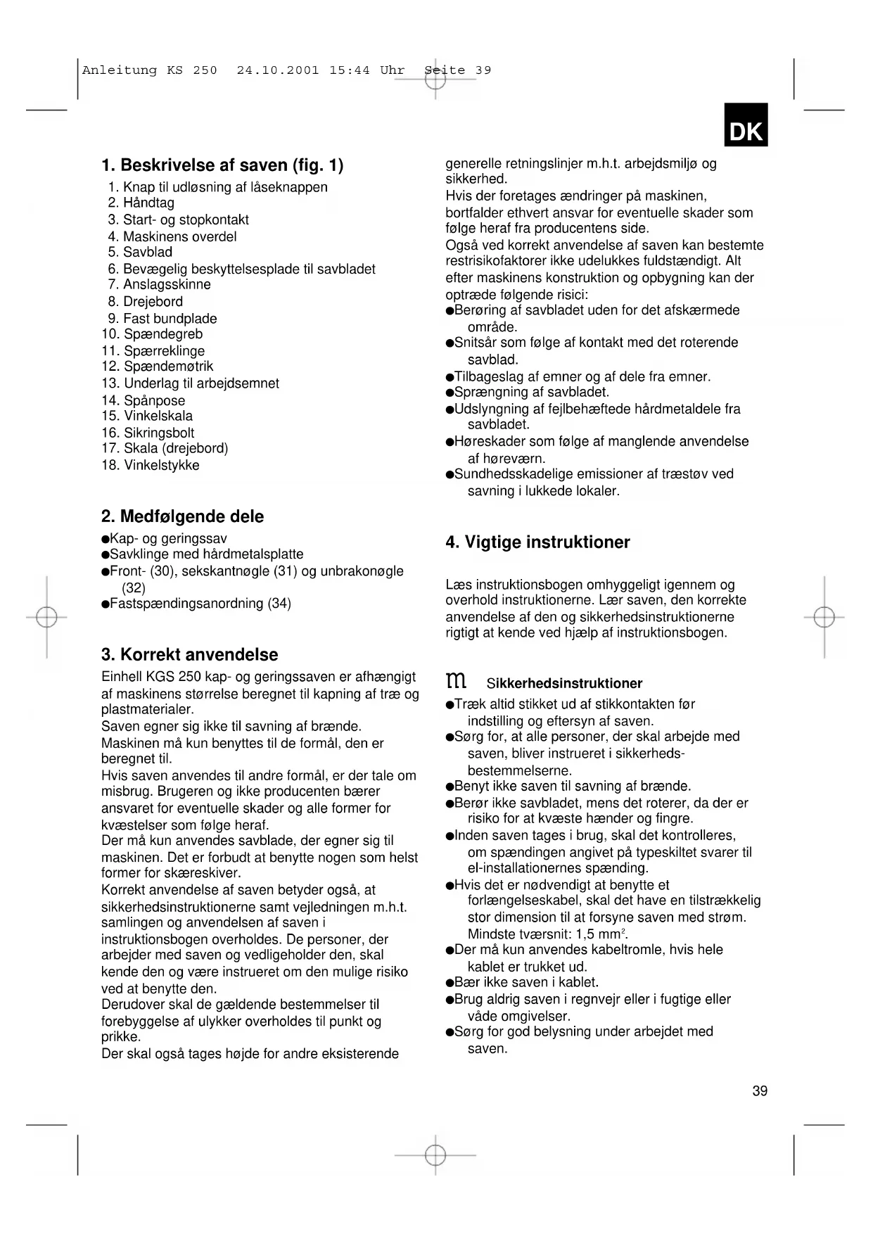 Læs instruktionsbogen omhyggeligt igennem og overhold instruktionerne. Lær saven, den korrekte anvendelse af den og sikkerhedsinstruktionerne rigtigt at kende ved hjælp af instruktionsbogen. m Sikkerhedsinstruktioner Træk altid stikket ud af stikkontakten før indstilling og eftersyn af saven. Sørg for, at alle personer, der skal arbejde med saven, bliver instrueret i sikkerheds- bestemmelserne. Benyt ikke saven til savning af brænde. Berør ikke savbladet, mens det roterer, da der er risiko for at kvæste hænder og fingre. Inden saven tages i brug, skal det kontrolleres, om spændingen angivet på typeskiltet svarer til el-installationernes spænding. Hvis det er nødvendigt at benytte et forlængelseskabel, skal det have en tilstrækkelig stor dimension til at forsyne saven med strøm. Mindste tværsnit: 1,5 mm