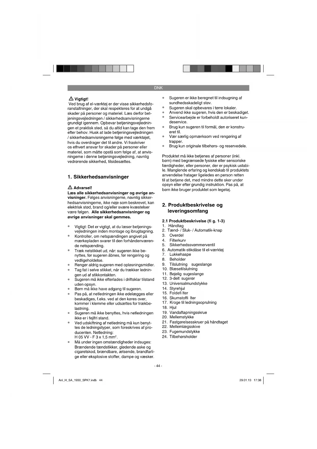 Montering af overdel (fi g. 6) Overdelen (3) er fastgjort til beholderen (8) med lukkehasperne (7). For at tage sugerens overdel (3) af åbnes lukkehasperne (7), og overdelen (3) løftes op. Sørg for, at lukkehasperne (7) går or- dentligt i indgreb, når overdelen (3) sættes på. Montering af hjul (fi g. 5) Monter hjulene som vist på fi g. 5. Montering af håndtag (fi g. 4) Monter håndtaget (1) med en skruetrækker. Anl_H_SA_1930_SPK7.indb 45Anl_H_SA_1930_SPK7.indb 45 29.01.13 17:3829.01.13 17:38DNK